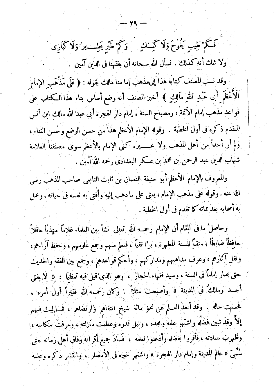وقد نسب المصنف كتابه هذا إلى مذهب إمامنا بقوله: " على مذهب الإمام أبي عبد الله مالك " أخبر المصنف أنه وضع أساس بناء هذا الكتاب على قواعد مذهب إمام الأئمة، ومصباح السنة، إمام دار الهجرة أبي عبد الله مالك بن أنس المتقدم ذكره في أول الخطبة. وقوله الإمام الأعظم هذا من حسن الوضع وحسن الثناء، ولم أر أحدا من أهل المذهب ولا غيره كنى الإمام بالأعظم سوى مصنفنا العلامة شهاب الدين عبد الرحمن بن محمد بن عسكر البغدادي رحمه الله آمين.