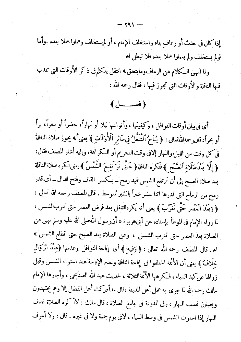 قال المصنف رحمه الله تعالى: " وبعد العصر حتى تغرب " يعني أنه يكره التنفل بعد فرض العصر حتى تغرب الشمس، لما رواه الإمام في الموطأ بإسناده عن أبي هريرة " أن رسول الله صلى الله عليه وسلم نهى عن الصلاة بعد العصر حتى تغرب الشمس، وعن الصلاة بعد الصبح حتى تطلع الشمس " اهـ. قال المصنف رحمه الله تعالى: " وفيه " أي إباحة النوافل وعدمها " عند الزوال خلاف " يعني أن الأئمة اختلفوا في إباحة النافلة وعدم الإباحة عند استواء الشمس وقبل زوالها عن كبد السماء، فكرهها الأئمة الثلاثة، لحديث عبد الله الصنابحي، وأجازها الإمام مالك رحمه الله لما جرى به عمل أهل المدينة، قال ما أدركت أهل الفضل إلا وهو يجتهدون ويصلون نصف النهار، وفي المدونة في جامع الصلاة، قال مالك: لا أكره الصلاة نصف النهار إذا استوت الشمس في وسط السماء، لا في يوم جمعة ولا في غيره. قال: ولا أعرف