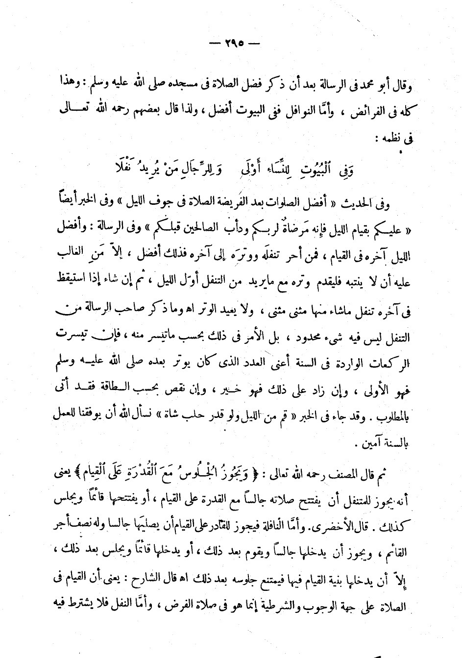وقال أبو محمد في الرسالة بعد أن ذكر فضل الصلاة في مسجده صلى الله عليه وسلم: وهذا كله في الفرائض، وأما النوافل ففي البيوت أفضل، ولذا قال بعضهم رحمه الله تعالى في نظمه: