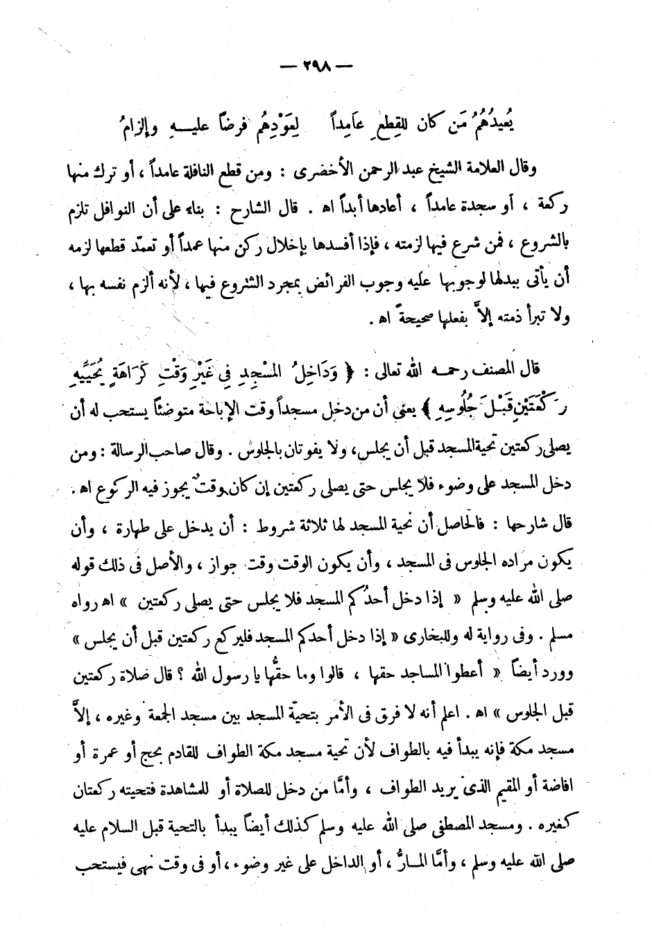 قال المصنف رحمه الله تعالى: " وداخل المسجد في غير وقت كراهة يحييه بركعتين قبل جلوسه " يعني أن من دخل مسجدا وقت الإباحة متوضئا يستحب له أن يصلي ركعتين تحية المسجد قبل أن يجلس، ولا يفوتان بالجلوس. وقال صاحب الرسالة: ومن دخل المسجد على وضوء فلا يجلس حتى يصلي ركعتين إن كان وقت يجوز فيه الركوع اهـ. قال شارحها: فالحاصل أن تحية المسجد لها ثلاثة شروط: أن يدخل على طهارة، وأن يكون مراده الجلوس في المسجد، وأن يكون الوقت وقت جواز، والأصل في ذلك قوله صلى الله عليه وسلم: " إذا دخل أحدكم المسجد فلا يجلس حتى يصلي ركعتين " اهـ رواه مسلم. وفي رواية له وللبخاري: " إذا دخل أحدكم المسجد فليركع ركعتين قبل أن يجلس " وورد أيضا: " أعطوا المساجد حقها، قالوا وما حقها يا رسول الله؟ قال صلاة ركعتين قبل الجلوس " اهـ. اعلم أنه لا فرق في الأمر بتحية المسجد بين مسجد الجمعة وغيره، إلا مسجد مكة فإنه يبدأ فيه بالطواف لأن تحية مسجد مكة الطواف للقادم بحج أو عمرة أو إفاضة أو المقيم الذي يريد الطواف، وأما من دخل للصلاة أو للمشاهدة فتحيته ركعتان كغيره. ومسجد المصطفى صلى الله عليه وسلم كذلك أيضا يبدأ بالتحية قبل السلام عليه صلى الله عليه وسلم، وأما المار، أو الداخل على غير وضوء، أو في وقت نهي فيستحب