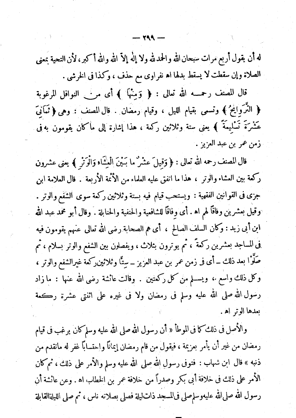 قال المصنف رحمه الله تعالى: " ومنها " أي من النوافل المرغوبة " التراويح " وتسمى بقيام الليل، وقيام رمضان. قال المصنف: وهي " ثماني عشرة تسليمة " يعني ستا وثلاثين ركعة، هذا إشارة إلى ما كان يقومون به في زمن عمر بن عبد العزيز.