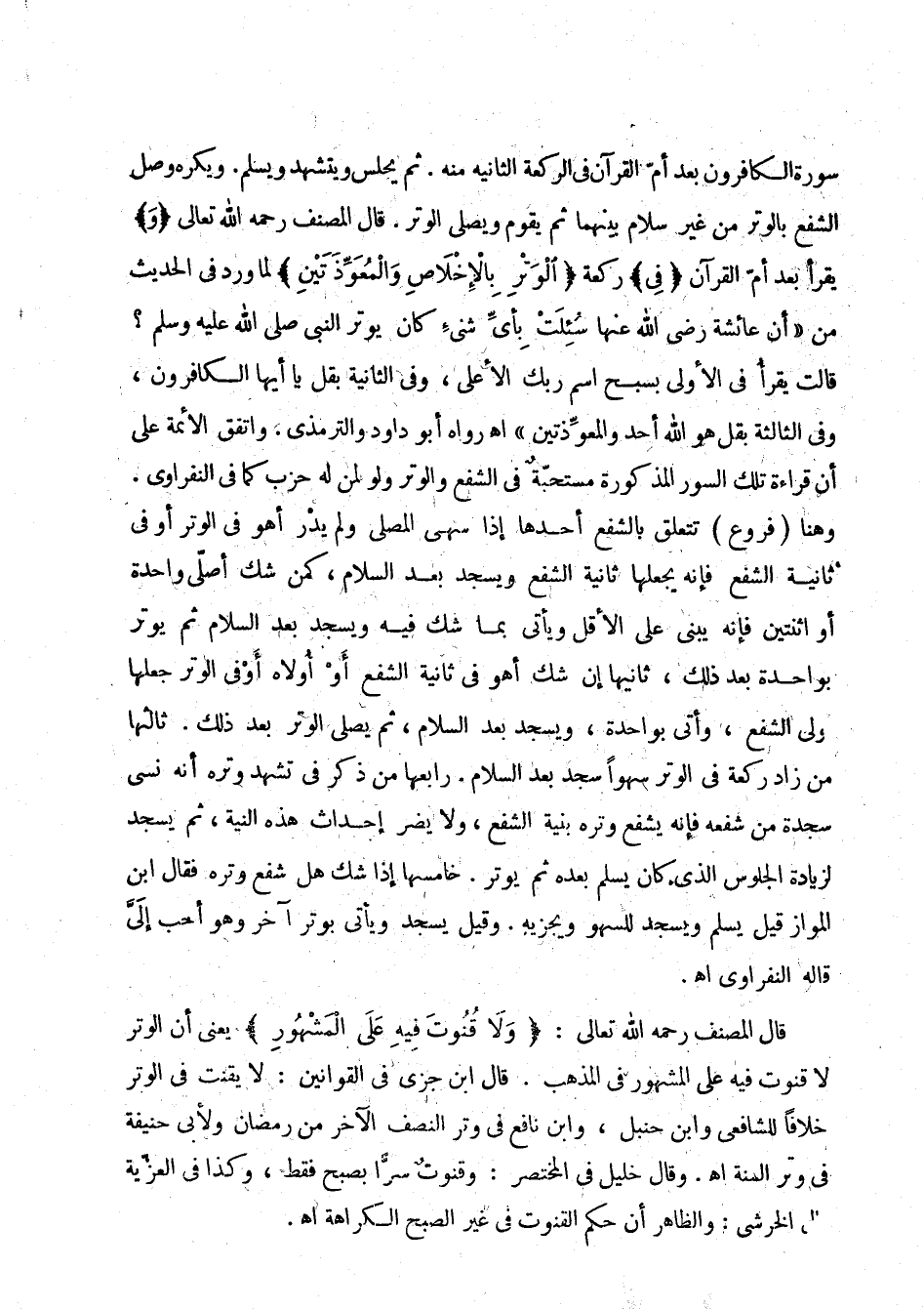 سورة الكافرون بعد أم القرآن في الركعة الثانية منه. ثم يجلس ويتشهد ويسلم. ويكره وصل الشفع بالوتر من غير سلام بينهما ثم يقوم ويصلي الوتر. قال المصنف رحمه الله تعالى " و " يقرأ بعد أم القرآن " في " ركعة " الوتر بالإخلاص والمعوذتين " لما ورد في الحديث من " أن عائشة رضي الله عنها، سئلت بأي شئ كان يوتر النبي صلى الله عليه وسلم؟ قالت يقرأ في الأولى بسبح اسم ربك الأعلى، وفي الثانية بقل يا أيها الكافرون، وفي الثالثة بقل هو الله أحد