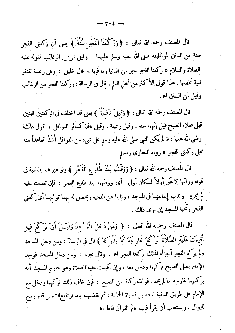 قال المصنف رحمه الله تعالى: " وركعتا الفجر سنة " يعني أن ركعتي الفجر سنة من السنن لمواظبته صلى الله عليه وسلم عليهما. وقيل من الرغائب لقوله عليه الصلاة والسلام: " ركعتا الفجر خير من الدنيا وما فيها " قال خليل: وهي رغيبة تفتقر لنية تخصها. هذا قول الأكثر من أهل العلم. قال في الرسالة: وركعتا الفجر من الرغائب وقيل من السنن اهـ.