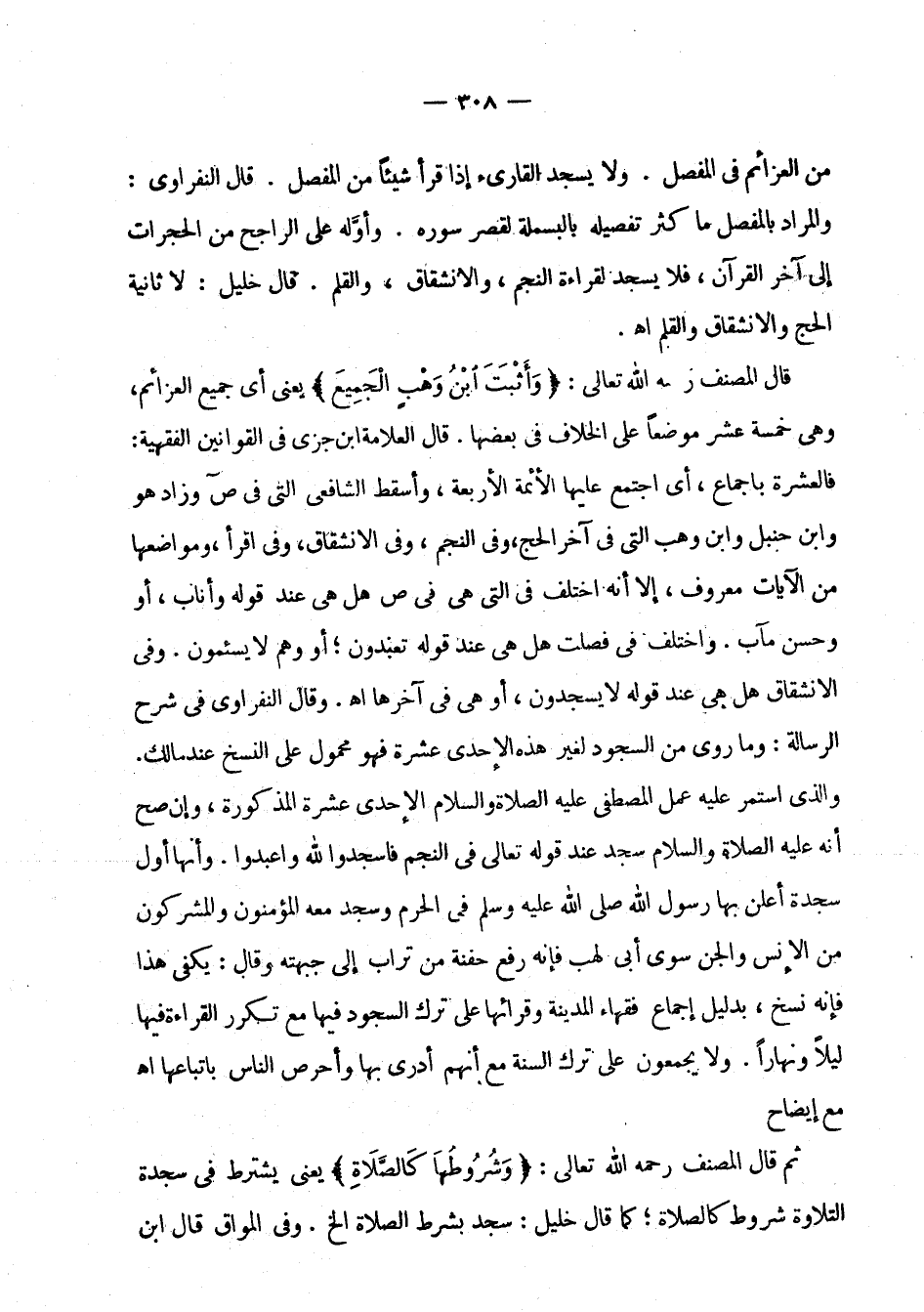 قال المصنف رحمه الله تعالى: " وأثبت ابن وهب الجميع " يعني أي جميع العزائم، وهي خمسة عشر موضعا على الخلاف في بعضها. قال العلامة ابن جزي في القوانين الفقهية: فالعشرة بإجماع، أي اجتمع عليها الأئمة الأربعة، وأسقط الشافعي التي في ص وزاد هو وابن حنبل وابن وهب التي في آخر الحج، وفي النجم، وفي الانشقاق، وفي اقرأ، ومواضعها من الأيات معروفة، إلا أنه اختلف في التي هي في ص هل هي عند قوله وأناب، أو وحسن مآب. واختلف في فصلت هل هي عند قوله تعبدون، أو وهم لا يسئمون. وفي الانشقاق هل هي عند قوله لا يسجدون، أو هي في آخرها اهـ. وقال النفراوي في شرح الرسالة: وما روي من السجود لغير هذه الإحدى عشرة فهو محمول على النسخ عند مالك. والذي استمر عليه عمل المصطفى عليه الصلاة والسلام الإحدى عشرة المذكورة، وإن صح أنه عليه