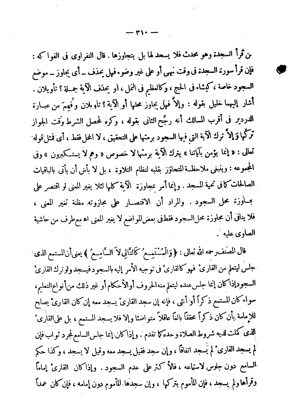 قال المصنف رحمه الله تعالى: " والمستمع كالتالي لا السامع " يعني أن المستمع الذي جلس ليتعلم من القارئ فهو في توجيه الأمر إليه بالسجود فيسجد ولو ترك القارئ السجود إذا كان إنما جلس عنده ليتعلم منه الحروف أو الأحكام أو غير ذلك من أنواع التعليم، سواء كان المستمع ذكرا أو أنثى، فإنه إن سجد القارئ يسجد معه إن كان القارئ يصلح للإمامة بأن كان ذكرا محققا بالغا عاقلا متوضئا وإلا فلا يسجد المستمع، بل على القارئ الذي كملت لديه شروط الصلاة وحده كما تقدم. وإذا كان إنما جلس السامع لمجرد ثواب فإن لم يسجد القارئ لم يسجد اتفاقا، وإن سجد فقيل يسجد معه وقيل لا يسجد، وكذا حكم السامع دون جلوس لاستماعه، فالأكثر على عدم السجود. وإذا كان القارئ إماما وقرأها ولم يسجد، فإن المأموم يتركها، وإن سجدها المأموم دون إمامه، فإن كان عمدا