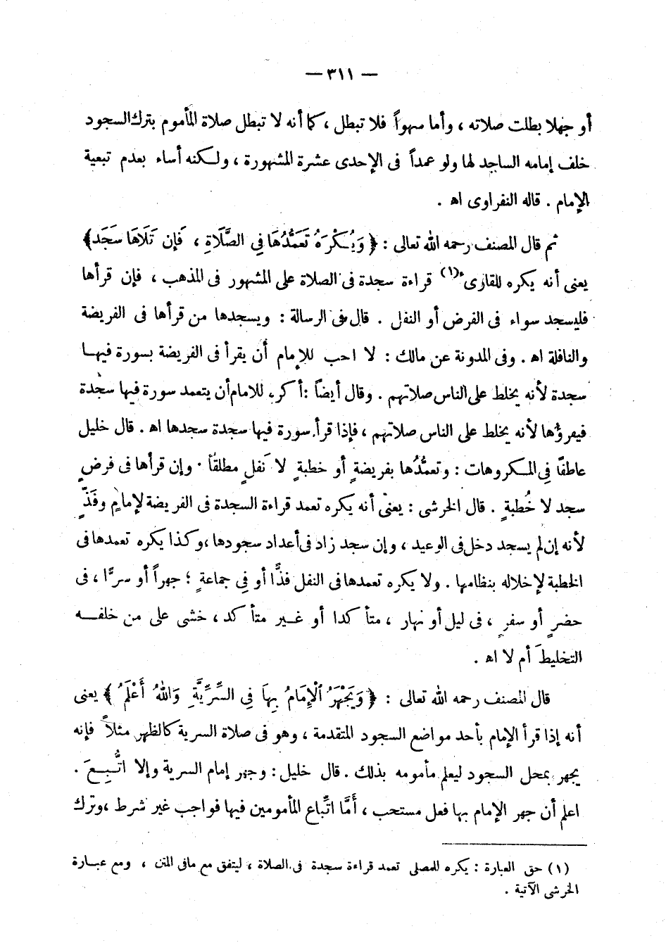 (¬1) حق العبارة: يكره للمصلي تعمد قراءة سجدة في الصلاة، ليتفق مع ما في المتن، ومع عبارة الخرشي الآتية.