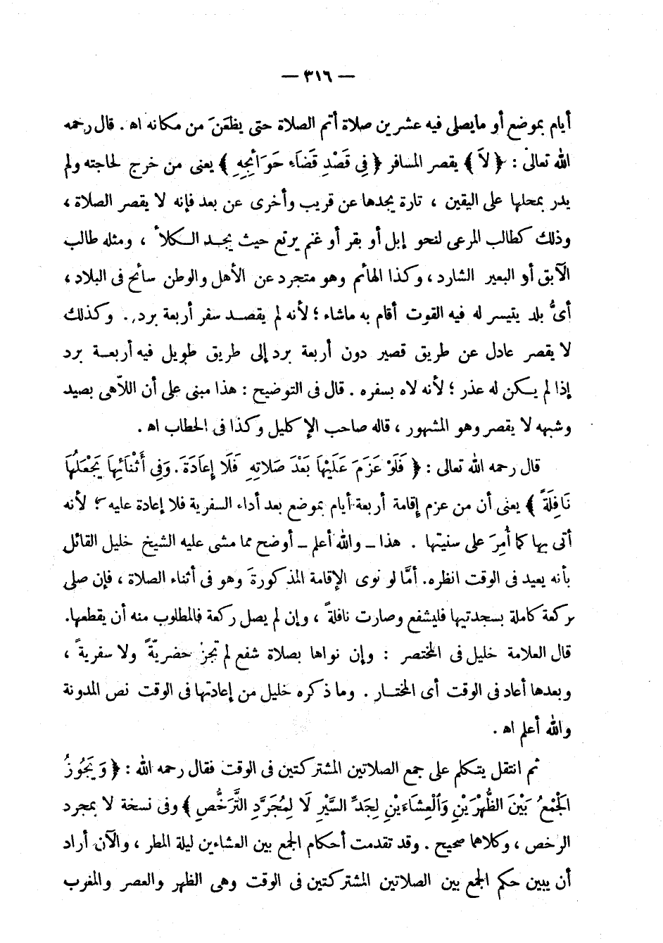 أيام بموضع أو ما يصلي فيه عشرين صلاة أتم الصلاة حتى يظعن من مكانه اهـ. قال رحمه الله تعالى: " لا " يقصر المسافر " في قصد قضاء حوائجه " يعني من خرج لحاجته ولم يدر بمحلها على اليقين، تارة يجدها عن قريب وأخرى عن بعد فإنه لا يقصر الصلاة، وذلك كطالب المرعى لنحو إبل أو بقر أو غنم يرتع حيث يجد الكلأ، ومثله طالب الآبق أو البعير الشارد، وكذا الهائم وهو متجرد عن الأهل والوطن سائح في البلاد، أي بلد يتيسر له فيه القوت أقام به ما شاء؛ لأنه لم يقصد سفر أربعة برد. وكذلك لا يقصر عادل عن طريق قصير دون أربعة برد إلى طريق طويل فيه أربعة برد إذا لم يكن له عذر؛ لأنه لاه بسفره. قال في التوضيح: هذا مبني على أن اللاهي بصيد وشبهه لا يقصر وهو المشهور، قاله صاحب الإكليل وكذا في الحطاب اهـ.