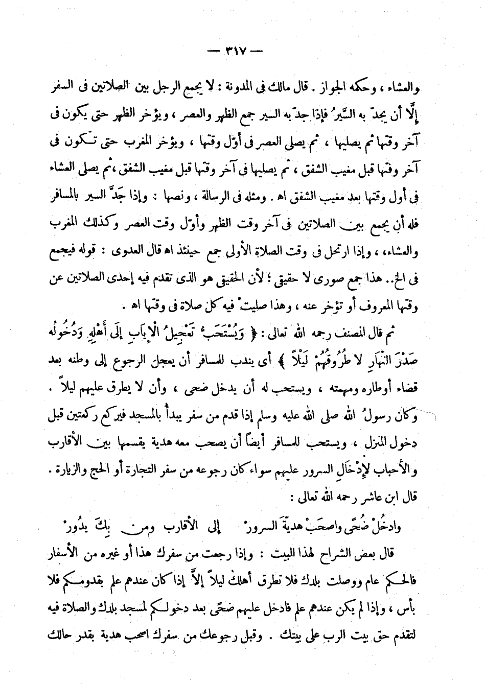 ثم قال المصنف رحمه الله تعالى: " ويستحب تعجيل الإياب إلى أهله ودخوله صدر النهار لا طروقهم ليلا " أي يندب للمسافر أن يعجل الرجوع إلى وطنه بعد قضاء أوطاره ومهمته، ويستحب له أن يدخل ضحى، وأن لا يطرق عليهم ليلا. وكان رسول الله صلى الله عليه وسلم إذا قدم من سفر يبدأ بالمسجد فيركع ركعتين قبل دخول المنزل، ويستحب للمسافر أيضا أن يصحب معه هدية يقسمها بين الأقارب والأحباب لإدخال السرور عليهم سواء كان رجوعه من سفر التجارة أو الحج والزيارة. قال ابن عاشر رحمه الله تعالى: