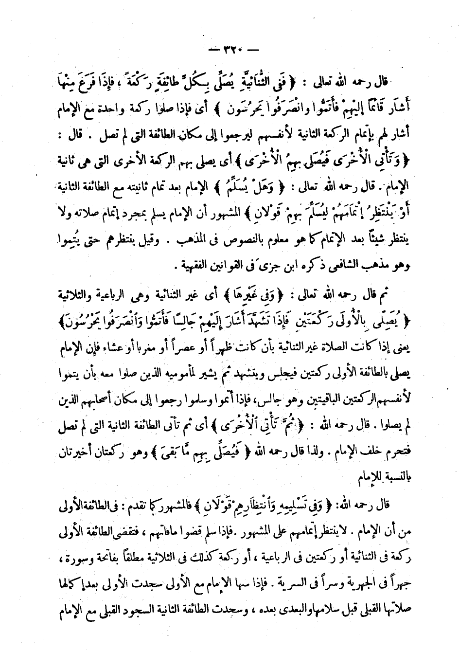 ثم قال رحمه الله تعالى: " وفي غيرها " أي غير الثنائية وهي الرباعية والثلاثية " يصلي بالأولى ركعتين فإذا تشهد أشار إليهم جالسا فأتموا وانصرفوا يحرسون " يعني إذا كانت الصلاة غير الثنائية بأن كانت ظهرا أو عصرا أو مغربا أو عشاء فإن الإمام يصلي بالطائفة الأولى ركعتين فيجلس ويتشهد ثم يشير لمأموميه الذين صلوا معه بأن يتموا لأنفسهم الركعتين الباقيتين وهو جالس، فإذا أتموا وسلموا رجعوا إلى مكان أصحابهم الذين لم يصلوا. قال رحمه الله: " ثم تأتي الأخرى " أي ثم تأتي الطائفة الثانية التي لم تصل فتحرم خلف الإمام. ولذا قال رحمه الله: " فيصلي بهم ما بقي " وهو ركعتان أخيرتان بالنسبة للإمام.