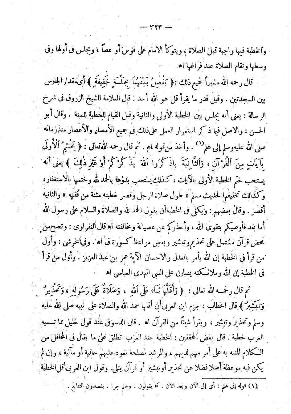 نبيه صلى الله عليه وسلم وتحذير وتبشير، ويقرأ شيئا من القرآن اهـ. قال الدسوقي عند قول خليل مما تسميه العرب خطبة. قال بعض المحققين: الخطبة عند العرب تطلق على ما يقال في المحافل من الكلام المنبه به على أمر مهم لديهم، والمرشد لمصلحة تعود عليهم حالية أو مآلية، وإن لم يكن فيه موعظة أصلا عن تحذير أو تبشير أو قرآن يتلى. وقول ابن العربي أقل الخطبة