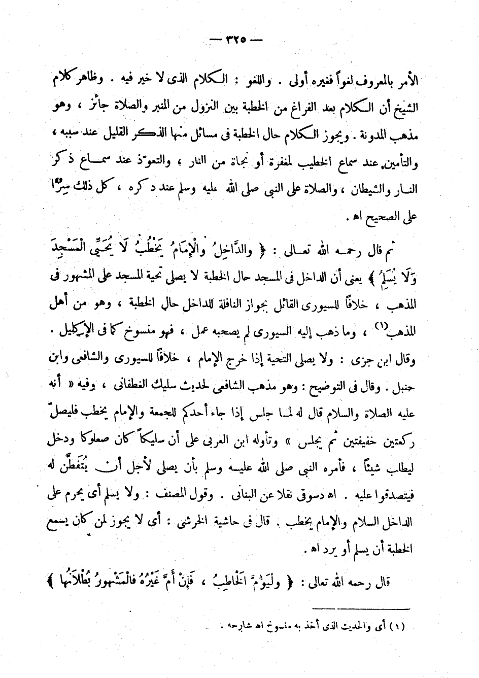 ثم قال رحمه الله تعالى: " والداخل والإمام يخطب لا يحيي المسجد ولا يسلم " يعني أن الداخل في المسجد حال الخطبة لا يصلي تحية المسجد على المشهور في المذهب، خلافا للسيوري القائل بجواز النافلة للداخل حال الخطبة، وهو من أهل المذهب (¬1)، وما ذهب إليه السيوري لم يصحبه عمل، فهو منسوخ كما في الإكليل. قال ابن جزي: ولا يصلي التحية إذا خرج الإمام، خلافا للسيوري والشافعي وابن حنبل. وقال في التوضيح: وهو مذهب الشافعي لحديث سليك الغطفاني، وفيه " أنه عليه الصلاة والسلام قال له لما جلس إذا جاء أحدكم للجمعة والإمام يخطب فليصل ركعتين خفيفتين ثم يجلس " وتأوله ابن العربي على أن سليكا كان صعلوكا ودخل ليطلب شيئا، فأمره النبي صلى الله عليه وسلم بأن يصلي لأجل أن يتفطن له فيتصدقوا عليه. اهـ الدسوقي نقلا عن البناني، وقول المصنف: ولا يسلم أي يحرم على الداخل السلام والإمام يخطب. قال في حاشية الخرشي: أي لا يجوز لمن كان يسمع الخطبة أن يسلم أو يرد اهـ.