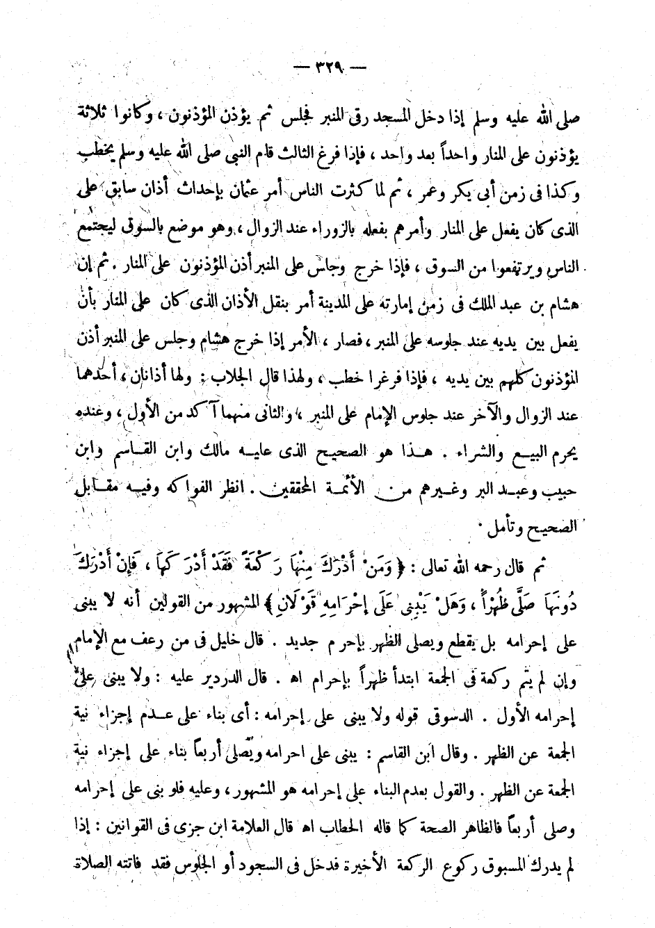 وجلس على المنبر أذن المؤذنون على المنار. ثم إن هشام بن عبد الملك في زمن إمارته على المدينة أمر بنقل الأذان الذي كان على المنار بأن يفعل بين يديه عند جلوسه على المنبر، فصار الأمر إذا خرج هشام وجلس على المنبر أذن المؤذنون كلهم بين يديه، فإذا فرغوا خطب، ولهذا قال الجلاب: ولها أذانان، أحدهما عند الزوال والآخر عند جلوس الإمام على المنبر، والثاني منهما آكد من الأول، وعنده يحرم البيع والشراء. هذا هو الصحيح الذي عليه مالك وابن القاسم وابن حبيب وعبد البر وغيرهم من الأئمة المحققين. انظر الفواكه وفيه مقابل الصحيح وتأمل.