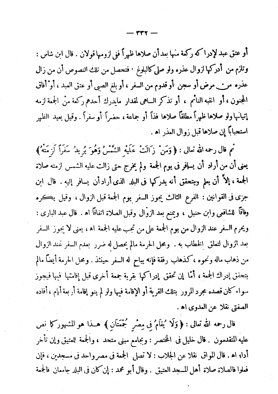 قال عبد الباري: ويحرم السفر عند الزوال من يوم الجمعة على من تجب عليه الجمعة اهـ، يعني لا يجوز السفر بعد الزوال لتعلق الخطاب به. ومحل الحرمة ما لم يحصل له ضرر بعدم السفر عند الزوال من ذهاب ماله ونحوه، كذهاب رفقة فإنه يباح له السفر حينئذ. ومحل الحرمة أيضا ما لم يتحقق إدراك الجمعة، أما إن تحقق إدراكها بقرية جمعة أخرى قبل إقامتها فيها فيجوز سواء كان قصده مجرد المرور بتلك القرية أو الإقامة فيها ولو لم ينو إقامة أربعة أيام، أفاده الصفتي نقلا عن العدوي اهـ.