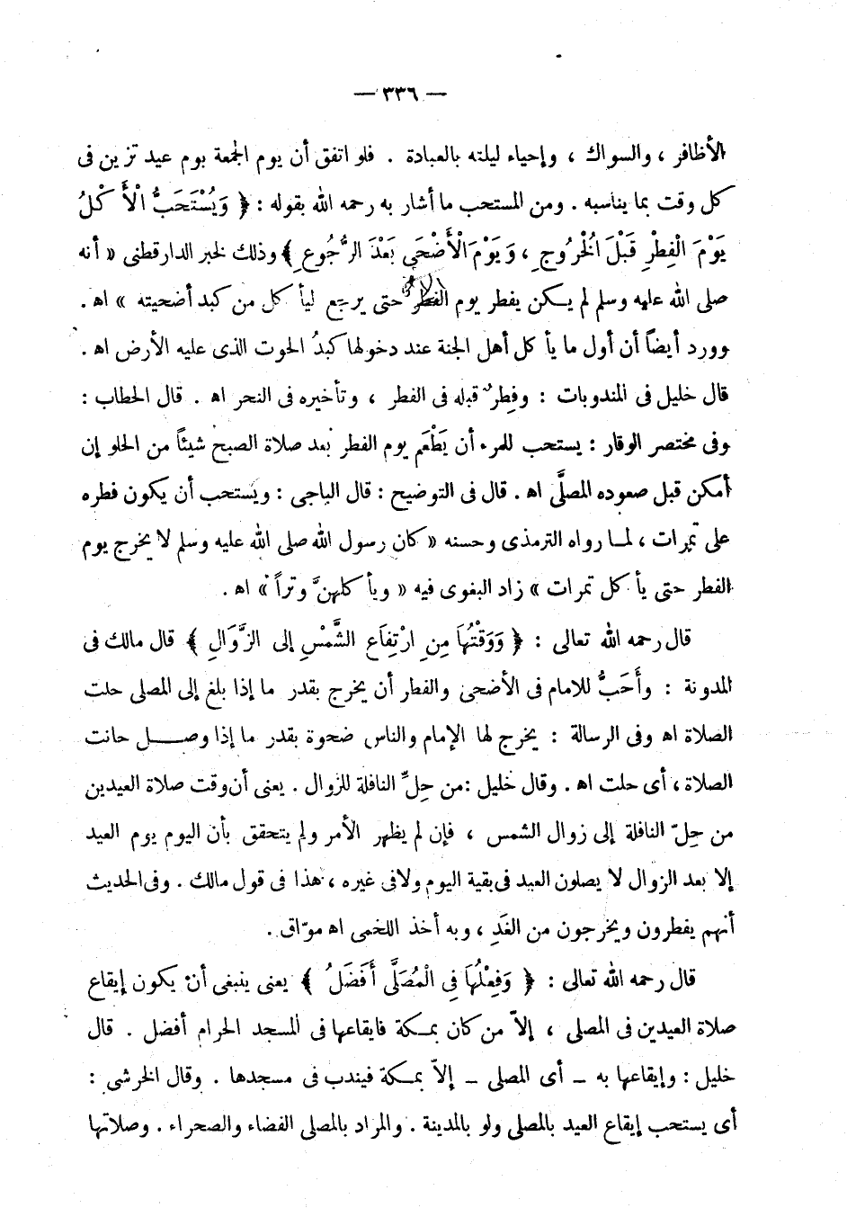 الله بقوله: " ويستحب الأكل يوم الفطر قبل الخروج، ويوم الأضحى بعد الرجوع " وذلك لخبر الدارقطني " أنه صلى الله عليه وسلم لم يكن يفطر حتى يرجع ليأكل من كبد أضحيته " اهـ. وورد أيضا أن أول ما يأكل أهل الجنة عند دخولها كبد الحوت الذي عليه الأرض اهـ. قال خليل في المندوبات: وفطر قبله في الفطر، وتأخيره في النحر اهـ. قال الحطاب: وفي مختصر الوقار: يستحب للمرء أن يطعم يوم الفطر بعد صلاة الصبح شيئا من الحلو إن أمكن قبل صعوده المصلى اهـ قال في التوضيح: قال الباجي: ويستحب أن يكون فطره على تمرات، لما رواه الترمذي وحسنه " كان رسول الله صلى الله عليه وسلم لا يخرج يوم الفطر حتى يأكل تمرات " زاد البغوي فيه " ويأكلهن وترا " اهـ.