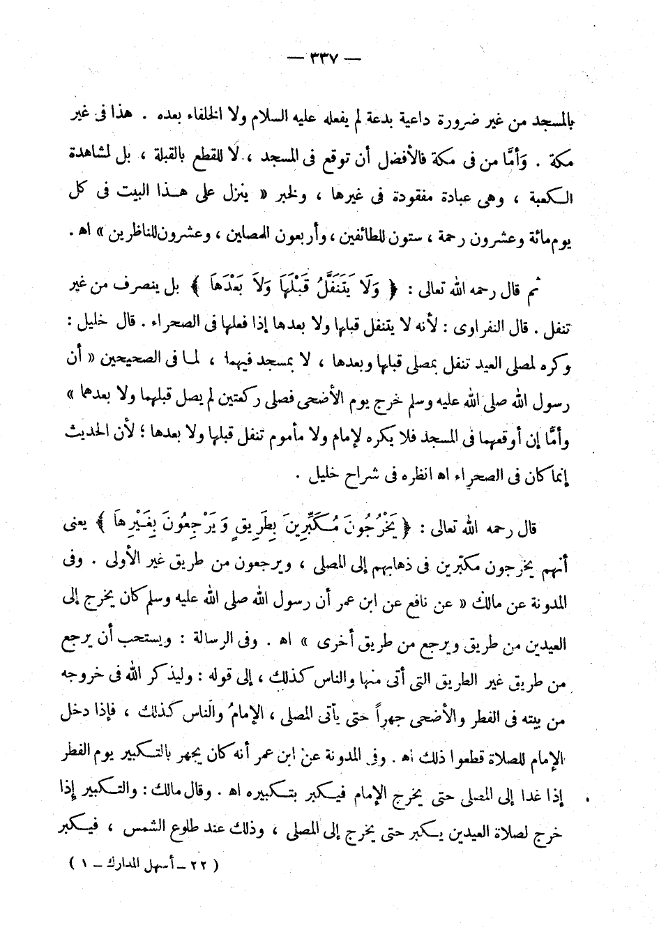 الصحراء. قال خليل: وكره لمصلي العيد تنفل بمصلى قبلها وبعدها، لا بمسجد فيهما، لما في الصحيحين " أن رسول الله صلى الله عليه وسلم خرج يوم الأضحى فصلى ركعتين لم يصل قبلهما ولا بعدهما " وأما إن أوقعهما في المسجد فلا يكره لإمام ولا مأموم تنفل قبلها ولا بعدها؛ لأن الحديث إنما كان في الصحراء اهـ انظره في شراح خليل.