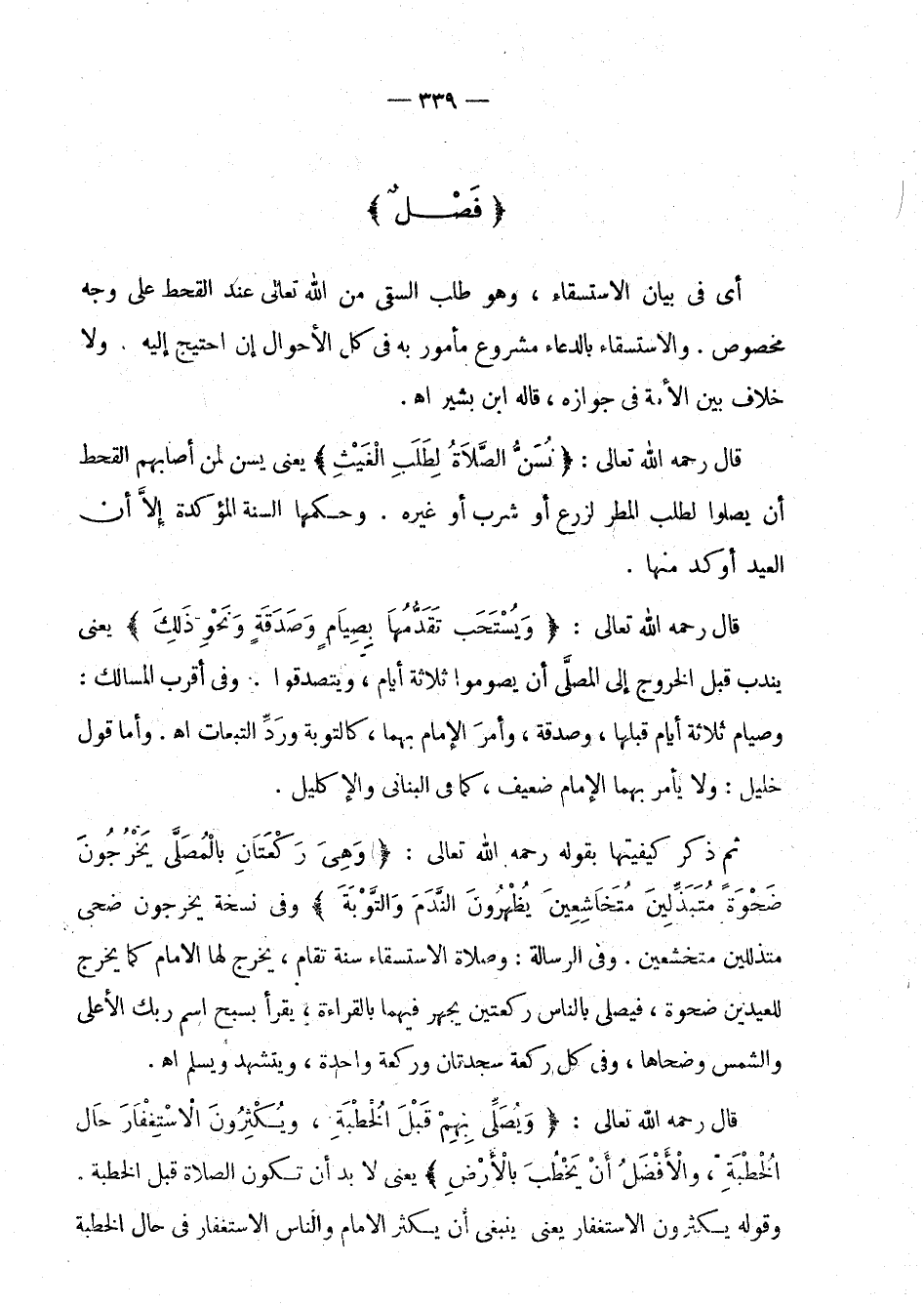 قال رحمه الله تعالى: " ويستحب تقدمها بصيام وصدقة ونحو ذلك " يعني يندب قبل الخروج إلى المصلى أن يصوموا ثلاثة أيام، ويتصدقوا. وفي أقرب المسالك: وصيام ثلاثة أيام قبلها، وصدقة، وأمر الإمام بهما، كالتوبة ورد التبعات اهـ. وأما قول خليل: ولا يأمر بهما الإمام ضعيف، كما في البناني والإكليل.
