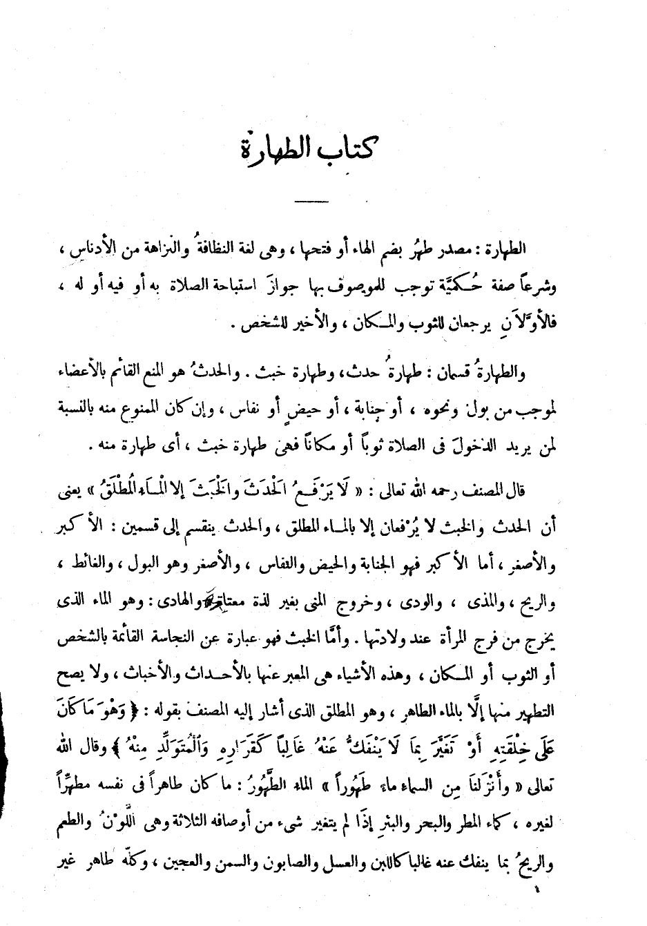 الماء الطهور: ما كان طاهرا في نفسه مطهرا لغيره، كماء المطر والبحر والبئر إذا لم يتغير شيء من أوصافه الثلاثة وهي اللون والطعم والريح بما ينفك عنه غالبا كاللبن والعسل والصابون والسمن والعجين، وكله طاهر غير