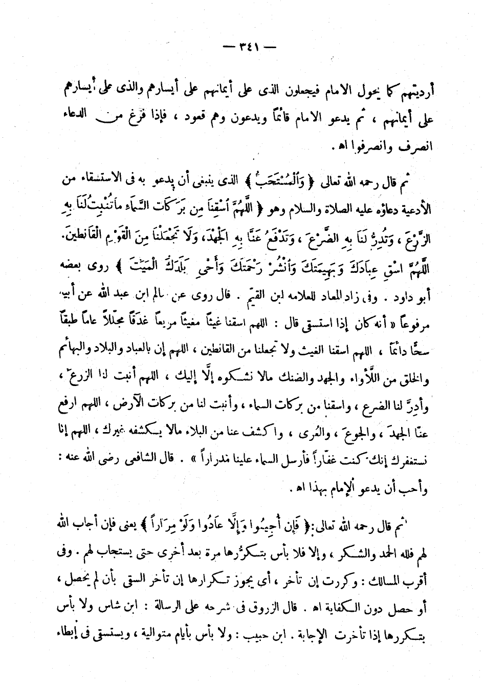 ثم قال رحمه الله تعالى: " والمستحب " الذي ينبغي أن يدعو به في الاستسقاء من الأدعية دعاؤه عليه الصلاة والسلام وهو: " اللهم اسقنا من بركات السماء ما تنبت لنا به الزرع، وتدبر لنا به الضرع، وتدفع عنا به الجهد، ولا تجعلنا من القوم القانطين. اللهم اسق عبادك وبهيمتك وانشر رحمتك وأخي بلدك الميت " روى بعضه أبو داود. وفي زاد المعاد للعلامة ابن القيم. قال روي عن سالم بن عبد الله عن أبيه مرفوعا " أنه كان إذا استسقى قال: اللهم اسقنا غيثا مغيثا مريعا غدقا مجللا