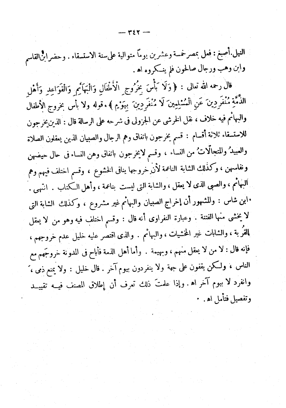 وقسم لا يخرجون باتفاق وهن النساء في حال حيضهن ونفاسهن، كذلك الشابة الناعمة لأن خروجها ينافي الخشوع، وقسم اختلف فيهم وهم البهائم، والصبي الذي لا يعقل، والشابة التي ليست بناعمة، وأهل الكتاب. انتهى. ابن شاس: والمشهور أن إخراج الصبيان والبهائم غير مشروع، وكذلك الشابة التي لا يخشى منها الفتنة. وعبارة النفراوي أنه قال: وقسم اختلف فيه وهو من لا يعقل القربة، والشابات غير المخشيات، والبهائم. والذي اقتصر عليه خليل عدم خروجهم، فإنه قال: لا من لا يعقل منهم، وبهيمة. وأما أهل الذمة فأباح في المدونة خروجهم مع الناس، ولكن يقفون على جهة ولا ينفردون بيوم آخر. قال خليل: ولا يمنع ذمي، وانفرد لا بيوم آخر اهـ. وإذا علمت ذلك تعرف أن إطلاق المصنف فيه تقييد وتفصيل فتأمل اهـ.