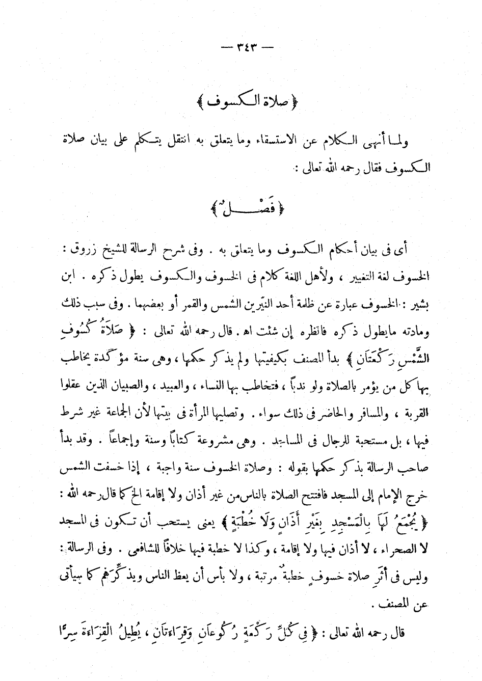 أي في بيان أحكام الكسوف وما يتعلق به. وفي شرح الرسالة زروق: الخسوف لغة التغيير، ولأهل اللغة كلام في الخسوف والكسوف يطول ذكره. ابن بشير: الخسوف عبارة عن ظلمة أحد النيرين الشمس والقمر أو بعضهما. وفي سبب ذلك ومادته ما يطول ذكره فانظره إن شئت اهـ. قال رحمه الله تعالى: " صلاة كسوف الشمس ركعتان " بدأ المصنف بكيفيتها ولم يذكر حكمها، وهي سنة مؤكدة يخاطب بها كل من يؤمر بالصلاة ولو ندبا، فتخاطب بها النساء، والعبيد، والصبيان الذين عقلوا القربة، والمسافر والحاضر في ذلك سواء. وتصليها المرأة في بيتها لأن الجماعة غير شرط فيها، بل مستحبة للرجال في المساجد. وهي مشروعة كتابا وسنة وإجماعا. وقد بدأ صاحب الرسالة بذكر حكمها بقوله: وصلاة الخسوف سنة واجبة، إذا خسفت الشمس خرج الإمام إلى المسجد فافتتح الصلاة بالناس من غير أذان ولا إقامة إلخ كما قال رحمه الله: " يجمع لها بالمسجد بغير أذان ولا خطبة " يعني أن تكون في المسجد لا الصحراء، لا أذان فيها ولا إقامة، وكذا لا خطبة فيها خلافا للشافعي. وفي الرسالة: وليس في أثر صلاة خسوف خطبة مرتبة، ولا بأس أن يعظ الناس ويذكرهم كما سيأتي عن المصنف.