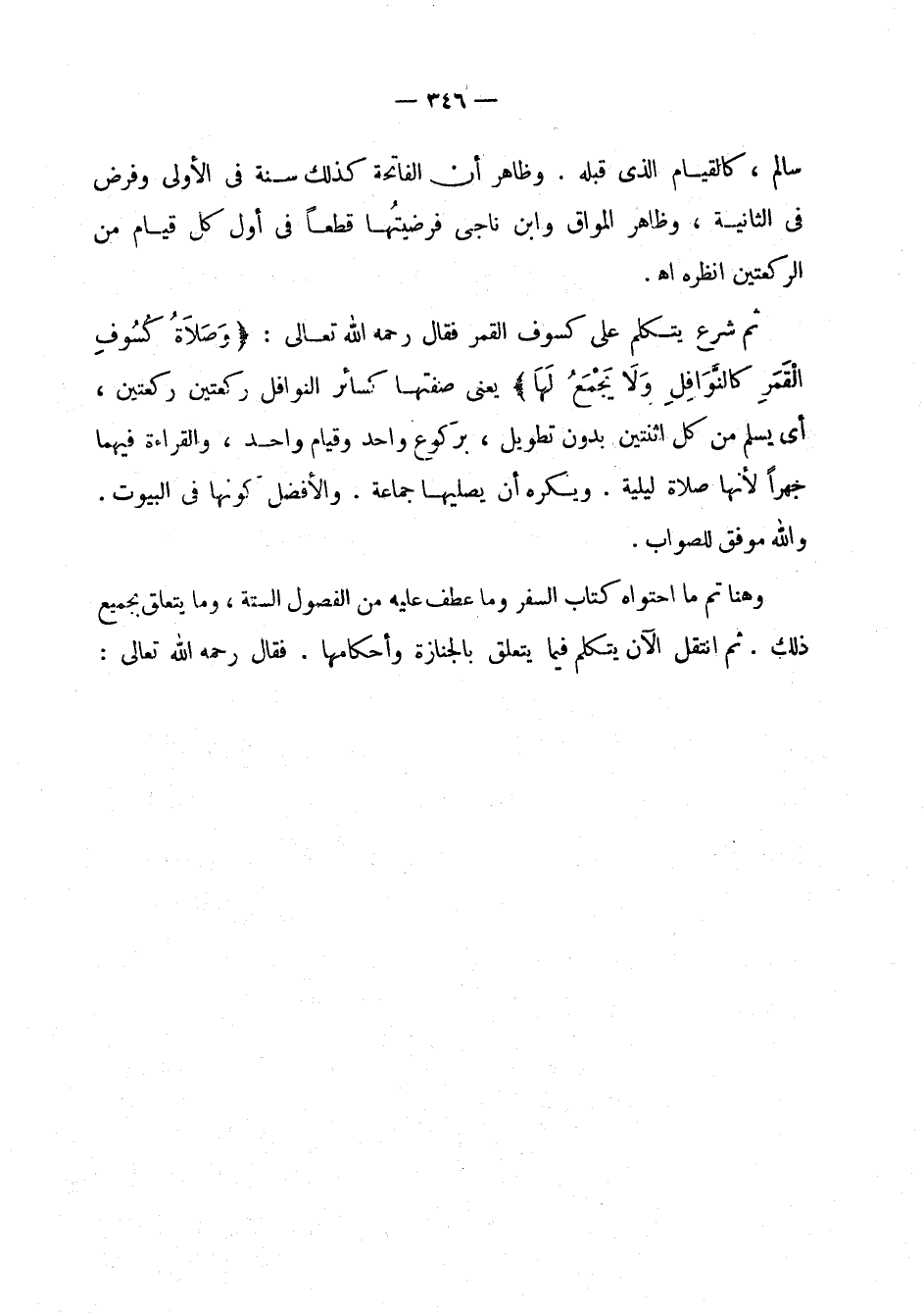 وهنا تم ما احتواه كتاب السفر وما عطف عليه من الفصول الستة، وما يتعلق بجميع ذلك. ثم انتقل الآن يتكلم فيما يتعلق بالجنازة وأحكامها. فقال رحمه الله تعالى:
