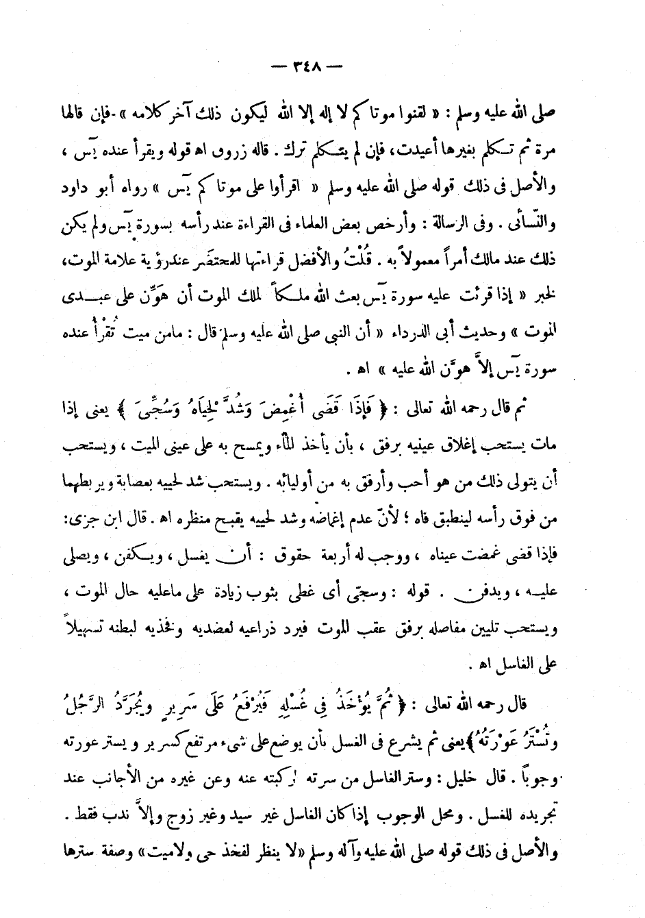 صلى الله عليه وسلم: " لقنوا موتاكم لا إله إلا الله ليكون ذلك آخر كلامه " فإن قالها مرة ثم تكلم بغيرها أعيدت، فإن لم يتكلم ترك. قاله زروق اهـ قوله ويقرأ عنده يس، والأصل في ذلك قوله صلى الله عليه وسلم: " اقرأوا على موتاكم يس " رواه أبو داود والنسائي. وفي الرسالة: وأرخص بعض العلماء في القراءة عند رأسه بسورة يس ولم يكن ذلك عند مالك أمرا معمولا به. قلت والأفضل قراءتها للمحتضر عند رؤية علامة الموت، لخبر: " إذا قرئت عليه سورة يس بعث الله ملكا