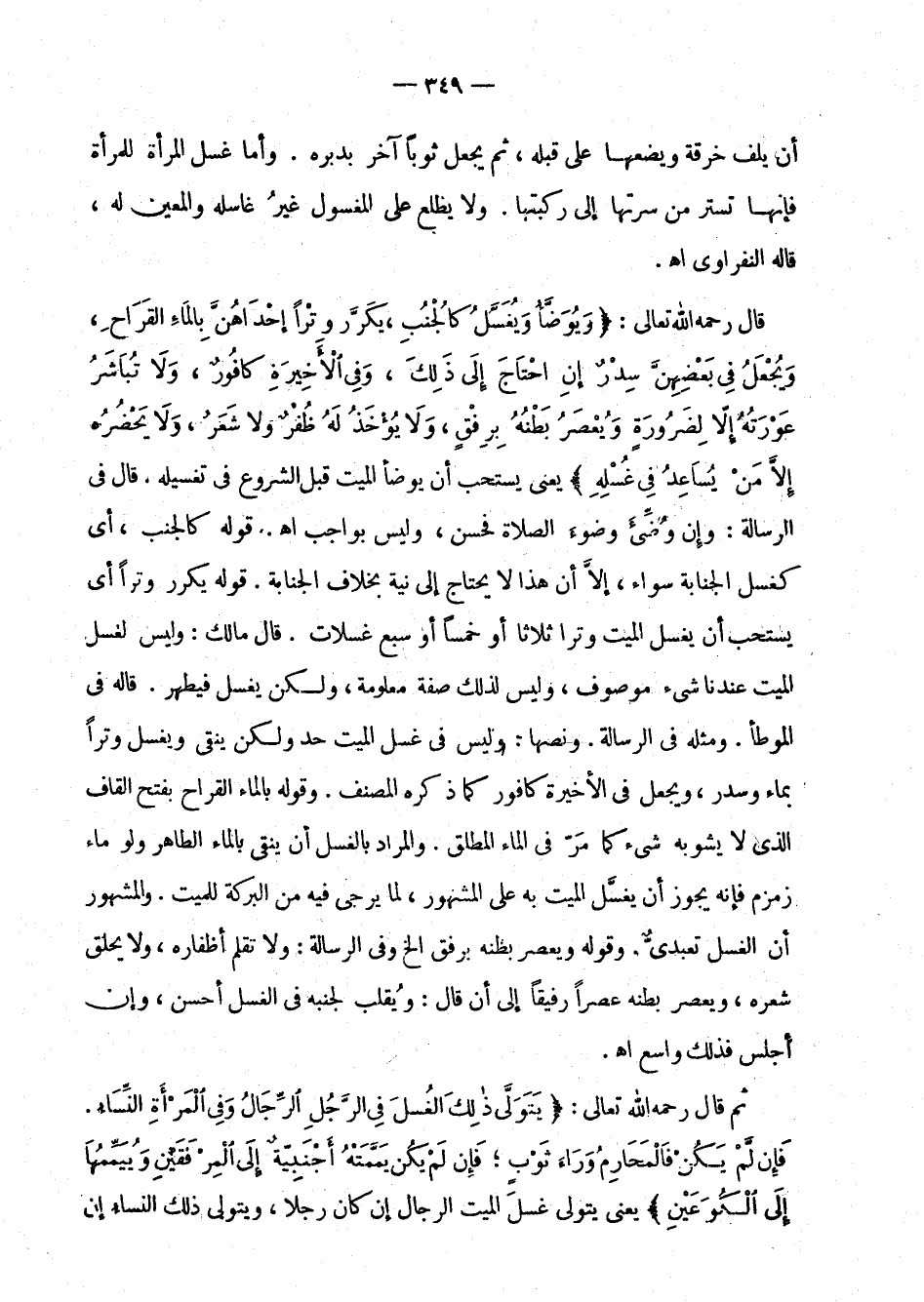 قوله كالجنب، أي كغسل الجنابة سواء، إلا أن هذا لا يحتاج إلى نية بخلاف الجنابة. قواه: يكرر وترا أي يستحب أن يغسل الميت وترا ثلاثا أو خمسا أو سبع غسلات. قال مالك: وليس لغسل الميت عندنا شيء موصوف، وليس لذلك صفة معلومة، ولكن يغسل فيطهر. قاله في الموطأ. ومثله في الرسالة. ونصها: وليس في غسل الميت حد ولكن ينقى ويغسل وترا بماء وسدر، ويجعل في الأخيرة كافور كما ذكره المصنف. وقوله بالماء القراح: بفتح القاف الذي لا يشوبه شيء كما مر في الماء المطلق. والمراد بالغسل أن ينقى بالماء الطاهر ولو ماء زمزم فإنه