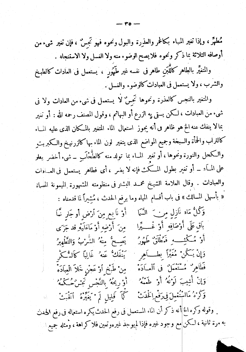 في شيء من العبادات، لكن يسقى به الزرع أو البهائم، وقول المصنف رحمه الله: أو تغير بما لا ينفك عنه إلخ هو ظاهر في أنه يجوز استعمال الماء المتغير بالمكان الذي عليه الماء كالتراب والحمأة والسبخة وجميع المواضع التي يتغير لون الماء بها كالزرنيخ والكبريت والكحل والنورة ونحوها، أو تغير بطول المكث فإنه لا يضر، أي فطاهر يستعمل في العادات والعبادات. وقال العلامة الشيخ محمد البشار في منظومته المشهورة الميمونة المسماة " بأسهل المسالك " في باب أقسام المياه وما يرفع الحدث، مشيرا لما قدمناه: