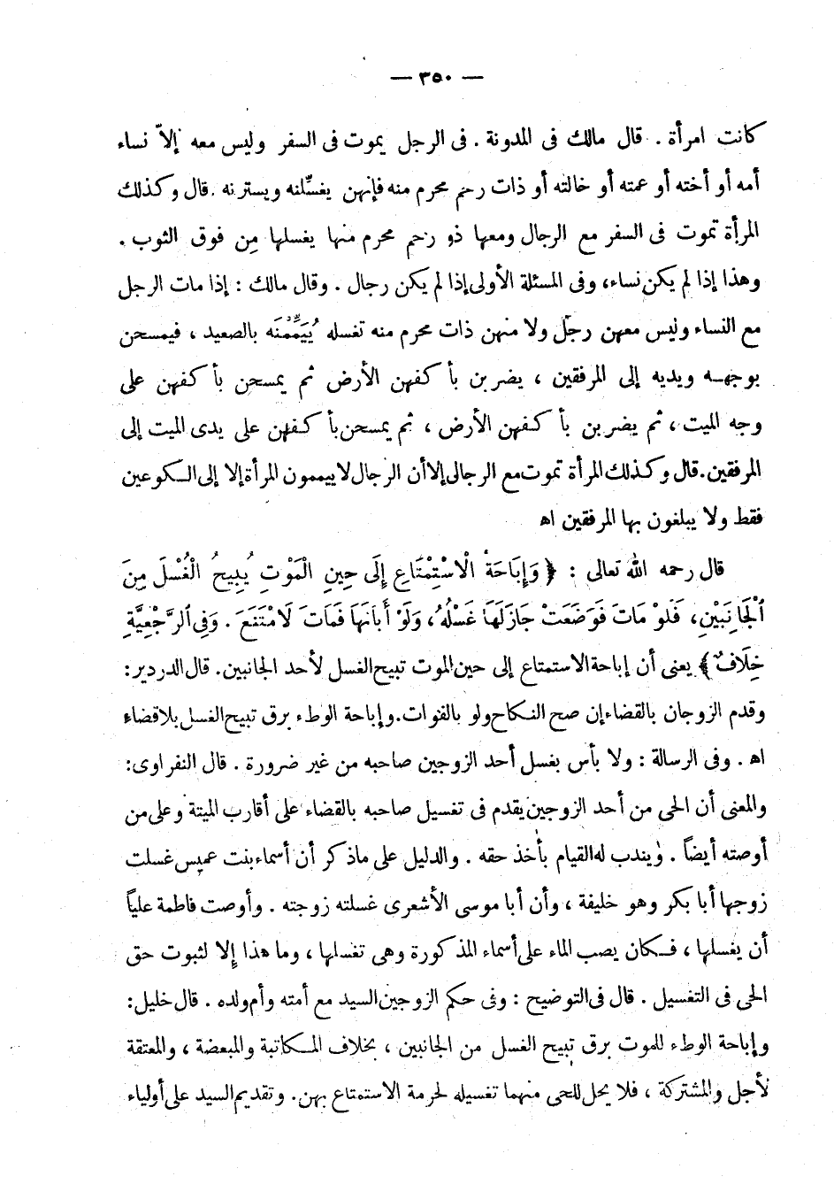 قال وكذلك المرأة تموت في السفر مع الرجال ومعها ذو رحم محرم منها يغسلها من فوق الثوب. وهذا إذا لم يكن نساء، وفي المسألة الأولى إذا لم يكن رجال , وقال مالك: إذا مات الرجل مع النساء وليس معهن رجل ولا منهن ذات محرم منه تغسله ييممنه بالصعيد، فيمسحن بوجهه ويديه إلى المرفقين، يضربن بأكفهن الأرض ثم يمسحن بأكفهن على وجه الميت، ثم يضربن بأكفهن الأرض، ثم يمسحن بأكفهن على يدي الميت إلى الرفقين. قال وكذلك المرأة تموت مع الرجال إلا أن الرجال لا ييممون المرأة إلا إلى الكوعين فقط ولا يبلغون بها المرفقين اهـ.
