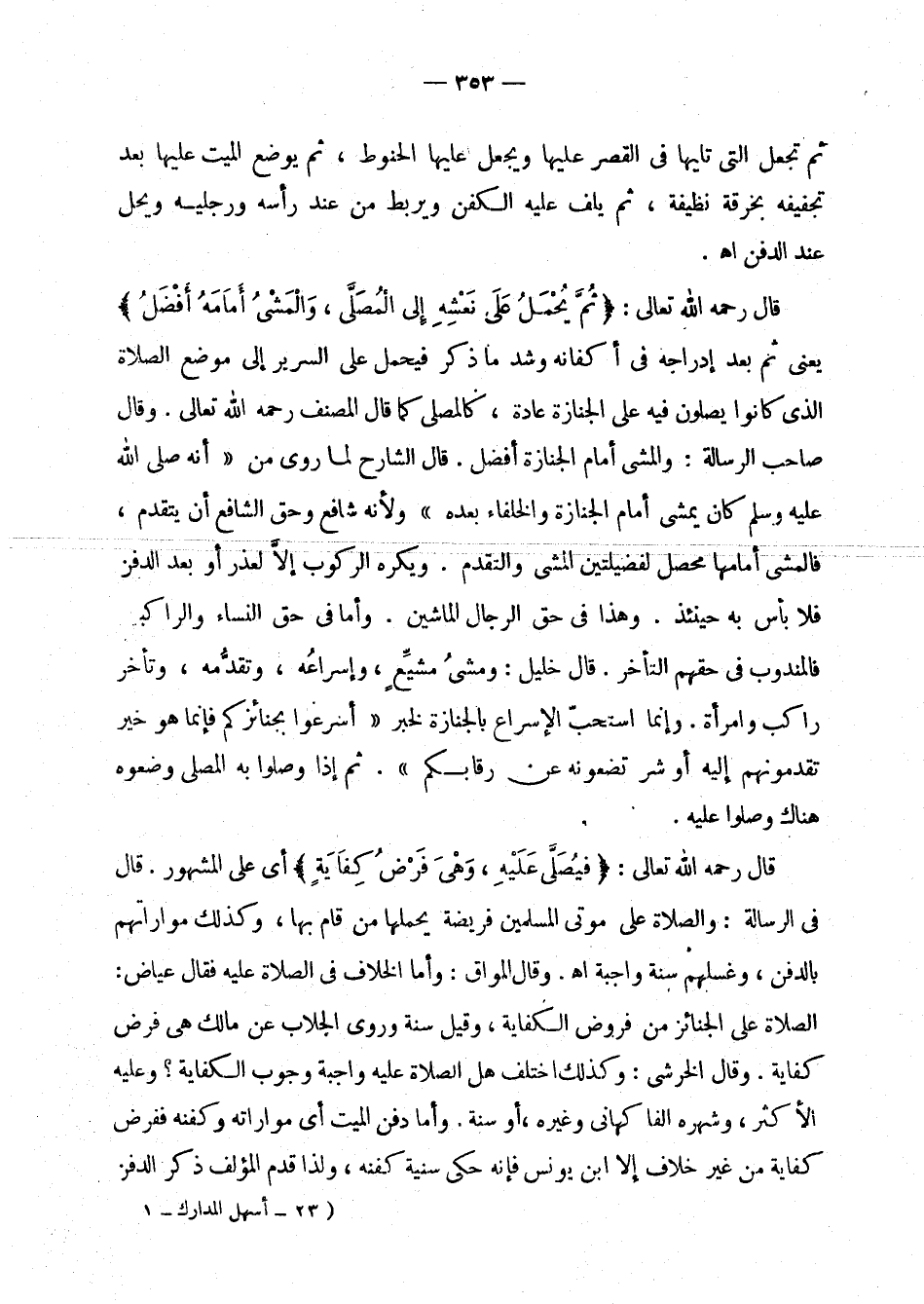 قال رحمه الله تعالى: " ثم يحمل على نعشه إلى المصلى، والمشي أمامه أفضل " يعني ثم بعد إدراجه في أكفانه رشد ما ذكر فيحمل على السرير إلى موضع الصلاة الذي كانوا يصلون فيه على الجنازة عادة، كالمصلى كما قال المصنف رحمه الله تعالى. وقال صاحب الرسالة: والمشي أمام الجنازة أفضل. قال الشارح لما روي من " أنه صلى الله عليه وسلم كان يمشي أمام الجنازة والخلفاء بعده " ولأنه شافع وحق الشافع أن يتقدم، فالمشي أمامها محصل لفضيلتين المشي والتقدم , ويكره الركوب إلا لعذر أو بعد الدفن فلا بأس به حينئذ. وهذا في حق الرجال الماشين. وأما في حق النساء والراكبين فالمندوب في حقهم التأخر. قال خليل: ومشي مشيع، وإسراعه، وتقدمه، وتأخر راكب وامرأة. وإنما استحب اإسراع بالجنازة لخبر " أسرعوا بجنائزكم فإنما هو خير تقدمونهم إليه أو شر تضعونه عن رقابكم ". ثم إذا وصلوا به المصلى وضعوه هناك وصلوا عليه.