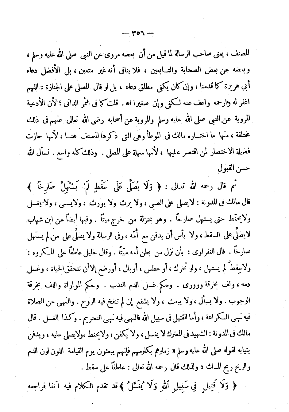 خليل عاطفا على المكروه: ولا سقط لم يستهل، ولو تحرك، أو عطس، أو بال، أو رضع إلا أن تتحقق الحياة، وغسل دمه، ولف بخرقة وووري. وحكم غسل الدم الندب. وحكم المواراة واللف بخرقة الوجوب. ولا يسأل، ولا يبعث، ولا يشفع إن لم تنفخ فيه الروح. والنهي عن الصلاة فيه نهي الكراهة، وأما القتيل في سبيل الله فالنهي فيه نهي التحريم. وكذا الغسل. قال مالك في المدونة: الشهيد في المعترك لا يغسل، ولا يكفن، ولا يحنط، ولا يصلى عليه، ويدفن بثيابه لقوله صلى الله عليه وسلم: " زملوهم بكاومهم فإنهم يبعثون يوم القيامة اللون لون الدم والريح ريح المسك " ولذلك قال رحمه الله تعالى: عاطفا على سقط.