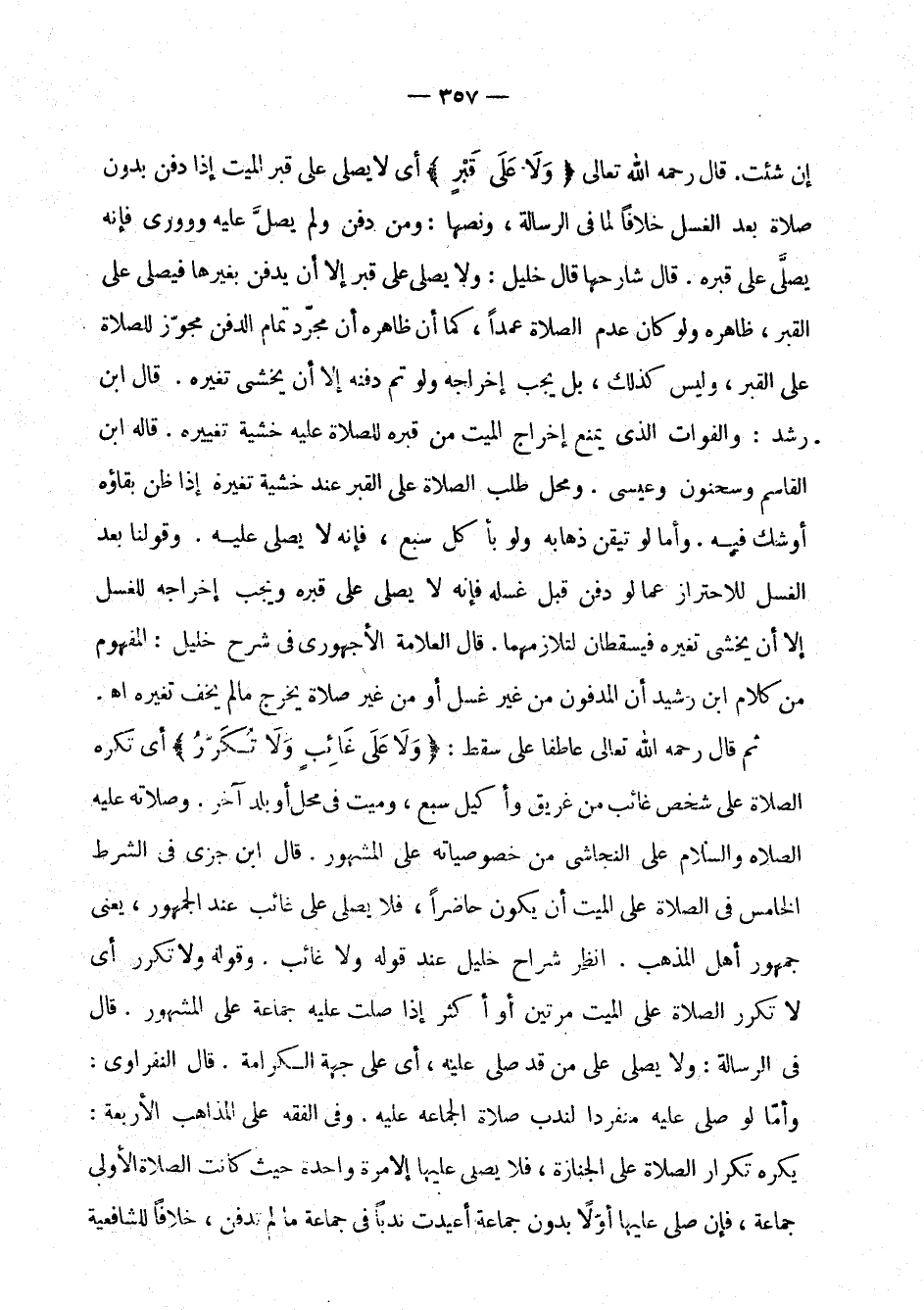إن شئت. قال رحمه الله تعالى: " ولا على قبر " أي يصلى على قبر الميت إذا دفن بدون صلاة بعد الغسل خلافا لما في الرسالة، ونصها: ومن دفن ولم يصل عليه وووري فإنه يصلى على قبره. قال شارحها قال خليل: ولا يصلى على قبر إلا أن يدفن بغيرها فيصلى على القبر، ظاهره ولو كان عدم الصلاة عمدا، كما أن ظاهره أن مجرد تمام الدفن مجوز للصلاة على القبر، وليس كذلك، بل يجب إخراجه ولو تم دفنه إلا أن يخشى تغيره. قال ابن رشد: والفوات الذي يمنع إخراج الميت من قبره للصلاة عليه خشية تغيره. قاله ابن القاسم وسحنون وعيسى. ومحل طلب الصلاة على القبر عند خشية تغيره إذا ظن بقاؤه أو شك فيه. وأما لو تيقن ذهابه ولو بأكل سبع، فإنه لا يصلى عليه. وقولنا بعد الغسل للاحتراز عما لو دفن قبل غسله فإنه لا يصلى على قبره ويجب إخراجه للغسل إلا أن يخشى تغيره فيسقطان لتلازمهما. قال العلامة الأجهوري في شرح خليل: المفهوم من كلام ابن رشد أن المدفون من غير غسل أو من غير صلاة يخرج ما لم يخرج ما لم يخف تغيره اهـ.