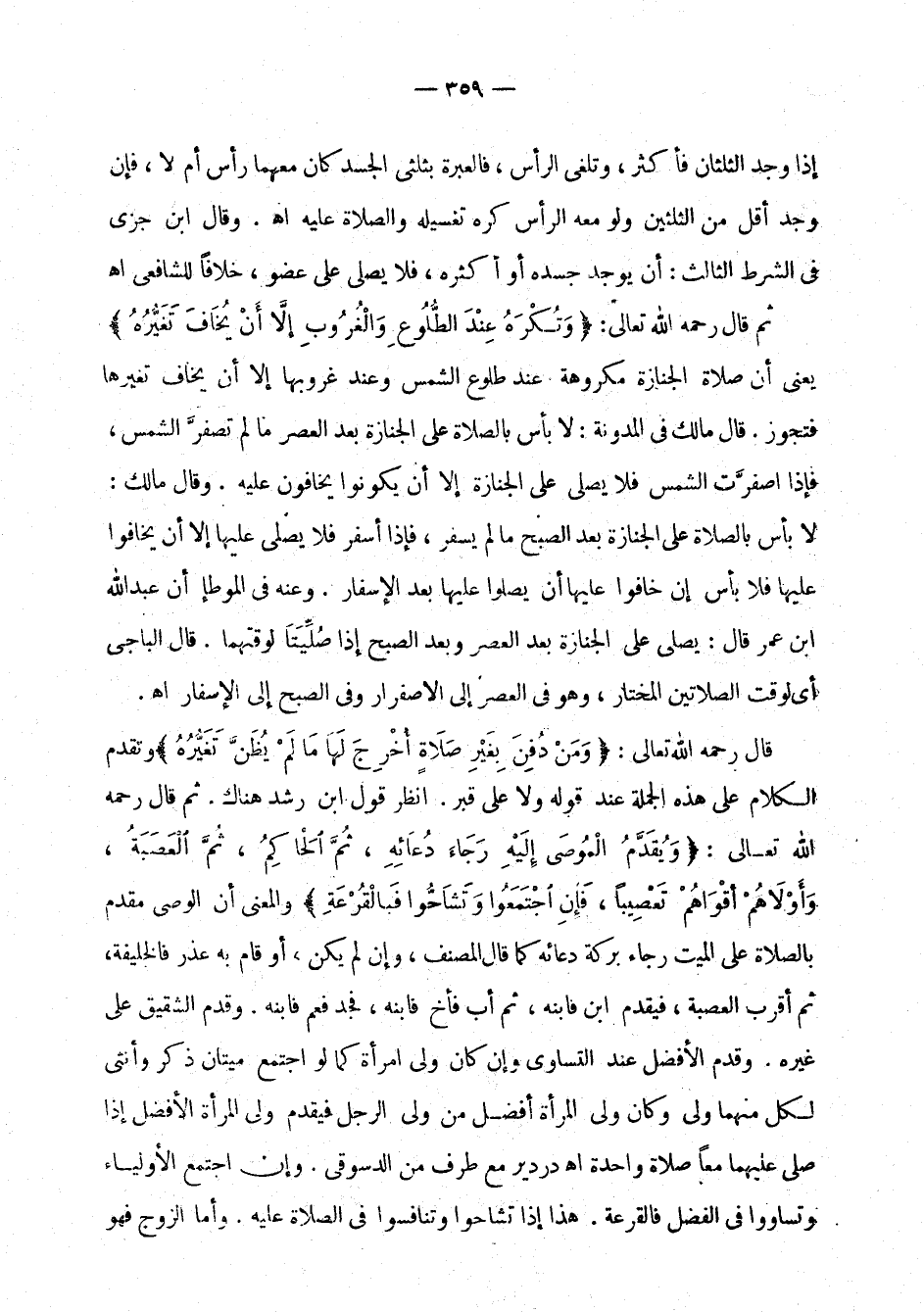 تغيرها فتجوز. قال مالك في المدونة: لا بأس بالصلاة على الجنازة بعد العصر ما لم تصفر الشمس، فإذا اصفرت الشمس فلا يصلى على الجنازة إلا أن يكونوا يخافون عليه. وقال مالك: لا بأس بالصلاة على الجنازة بعد الصبح ما لم يسفر، فإذا أسفر فلا يصلى عليها إلا أن يخافوا عليها فلا بأس إن خافوا عليها أن يصلوا عليها بعد الإسفار. وعنه في الموطأ أن عبد الله بن عمر قال: يصلى على الجنازة بعد العصر وبعد الصبح إذا صليتا لوقتهما. قال الباجي أي لوقت الصلاتين المختار، وهو في العصر إلى الاصفرار وفي الصبح إلى الإسفار اهـ.