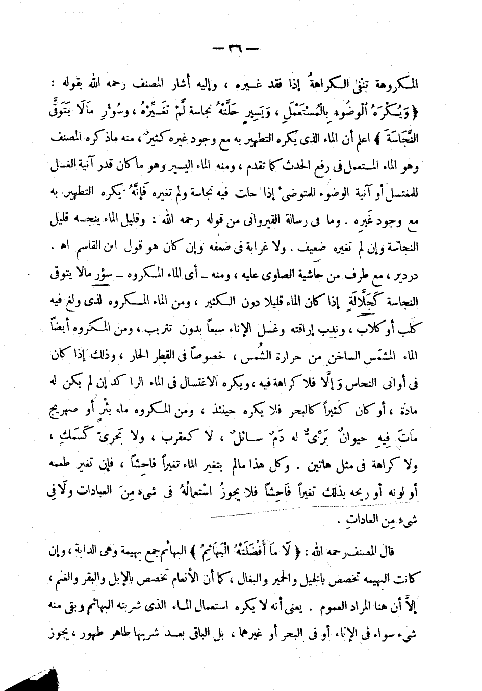 قال المصنف رحمه الله: " لا ما أفضلته البهائم " البهائم جمع بهيمة وهي الدابة، وإن كانت البهيمة تخصص بالخيل والحمير والبغال، كما أن الأنعام تخصص بالإبل والبقر والغنم، وإلا أن هنا المراد العموم. يعني أنه لا يكره استعمال الماء الذي شربته البهائم وبقي منه شيء سواه في الإناء أو في البحر أو غيرهما، بل الباقي بعد شربها طاهر طهور، يجوز