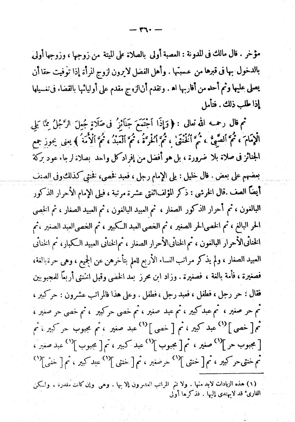 الخناثى الأحرار الصغار، ثم الخناثى العبيد الكبار، ثم الخناثى العبيد الصغار، ولم يذكر مراتب النساء الأربع للعلم بتأخرهن عن الجميع، وهي حرة بالغة، فصغيرة، فأمة بالغة، فصغيرة. وزاد ابن محرز بعد الخصي وقبل الخنثى أربعا للمجبوبين فقال: حر رجل، فطفل، فعبد رجل، فطفل. وعلى هذا فالمراتب عشرون: حر كبير، ثم حر صغير، ثم عبد كبير، ثم عبد صغير، ثم خصي حر كبير، ثم خصي حر صغير، ثم [خصي] (¬1) عبد كبير، ثم [خصي] عبد صغير، ثم [مجبوب] عبد صغير، ثم خنثي حر كبير، ثم [خنثى] حر صغير، ثم [خنثى] عبد كبير، ثم [خنثى]