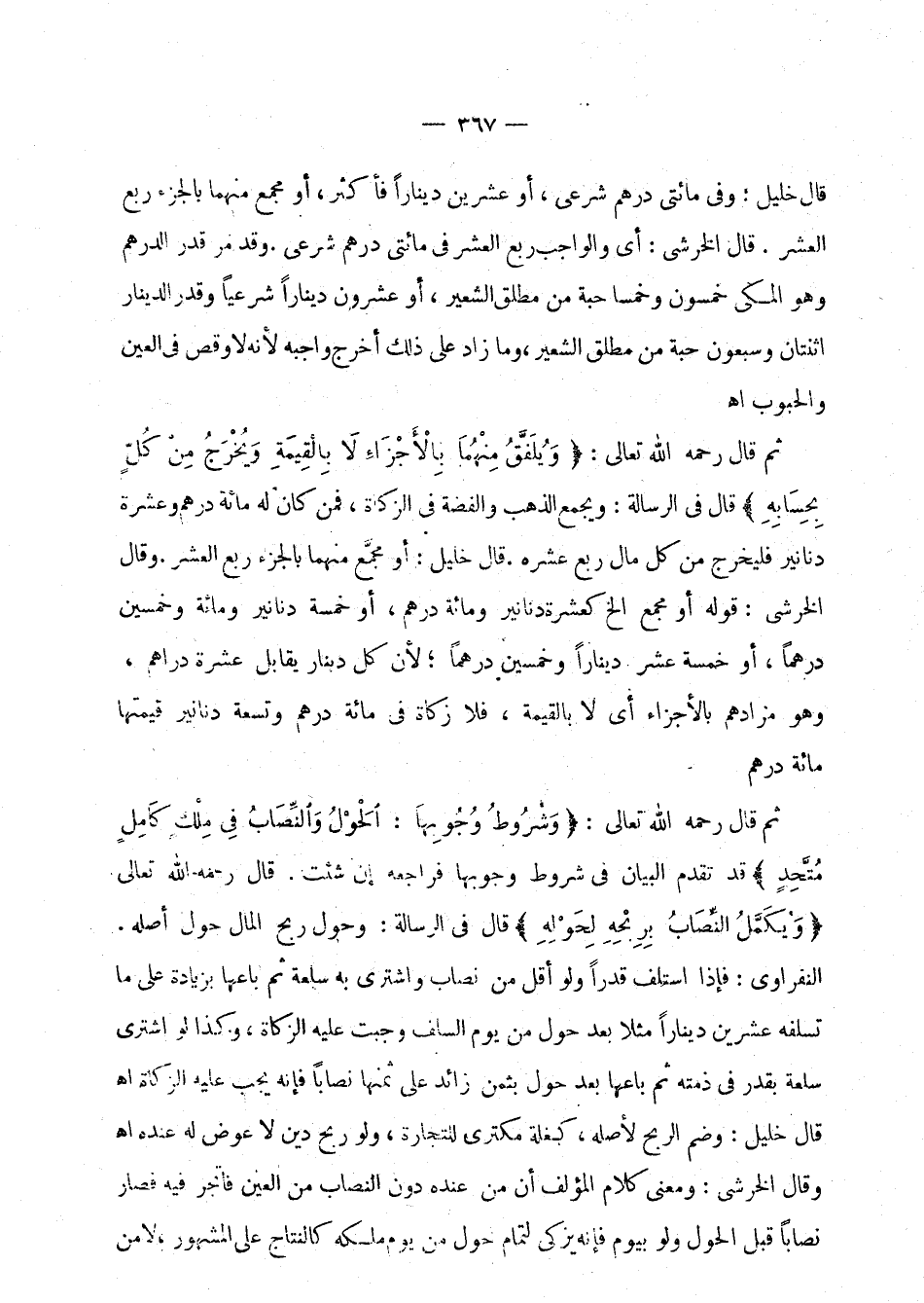 قال خليل: وفي مائتي درهم شرعي، أو عشرين دينارا فأكثر، أو مجمع منهما بالجزء ربع العشر. قال الخرشي: أي والواجب ربع العشر في مائتي درهم شرعي. وقد مر قدر الدرهم وهو المكي خمسون وخمسا حبة من مطلق الشعير، أو عشرون دينارا شرعيا وقدر الدينار اثنتان وسبعون حبة من مطلق الشعير، وما زاد على ذلك أخرج واجبه لأنه لا وقص في العين والحبوب اهـ.