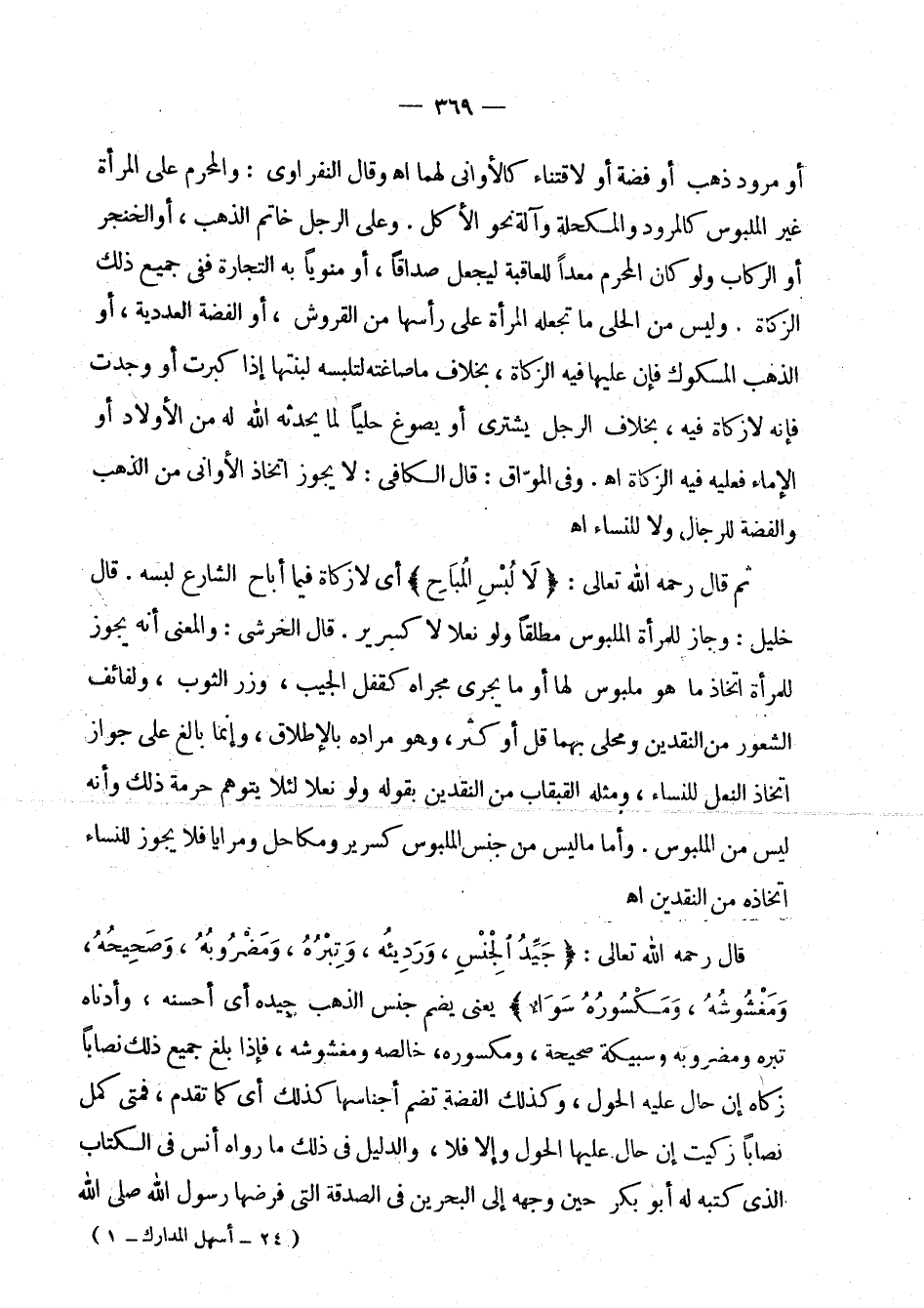 وعلى الرجل خاتم الذهب، أو الخنجر أو الركاب ولو كان المحرم معدا للعاقبة ليجعل صداقا، أو منوبا به التجارة ففي جميع ذلك الزكاة. وليس من الحلي ما تجعله المرأة على رأسها من القروش، أو الفضة العددية، أو الذهب المسكوك فإن عليها فيه الزكاة بخلاف ما صاغته لتلبسه لبنتها إذا كبرت أو وجدت فإنه لا زكاة فيه، بخلاف الرجل يشتري أو يصوغ حليا لما يحدثه الله له من الأولاد أو الإماء فعليه فيه الزكاة اهـ. وفي المواق: قال الكافي: لا يجوز اتخاذ الأواني من الذهب والفضة للرجال والنساء اهـ.