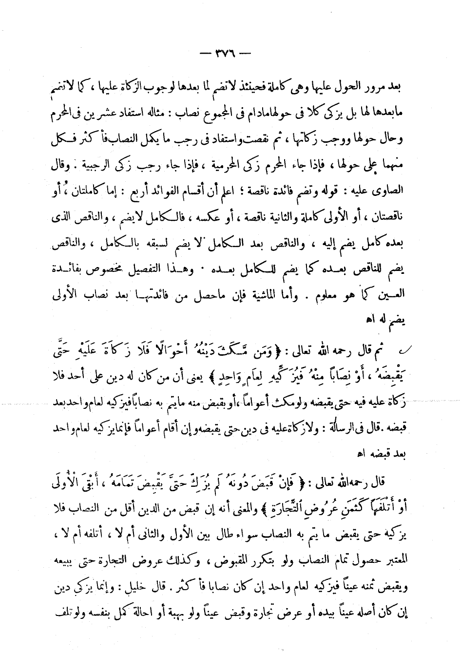 بعد مرور الحول عليها وهي كاملة فحينئذ لا تضم لما بعدها لوجوب الزكاة عليها، كما لا تضم ما بعدها لها بل يزكي كلا في حولها ما دام في المجموع نصاب: مثاله استفاد عشرين في المحرم وحال حولها ووجب زكاتها، ثم نقصت واستفاد في رجب ما يكمل النصاب فأكثر فكل منهما على حولها، فإذا جاء المحرم زكى المحرمية، فإذا جاء رجب زكى الرجبية.
