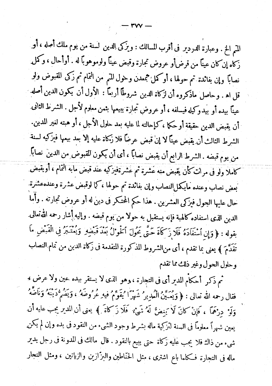 ثم ذكر أحكام المدير أي في التجارة، وهو الذي لا يستقر بيده عين ولا عرض، فقال رحمه الله تعالى: " ويعين المدير شهرا يقوم فيه عروضه، ويضم دينه وناضه ولو درهما، فإن كان لا ينض له شيء فلا زكاة " يعني أن المدير يجب عليه أن يعين شهرا معلوما في السنة ليزكية ماله بشرط وجود الشيء من النقود في يده وإن لم يكن شيء من ذاك فلا يجب عليه زكاة حتى يبيع بالنقود. قال مالك في