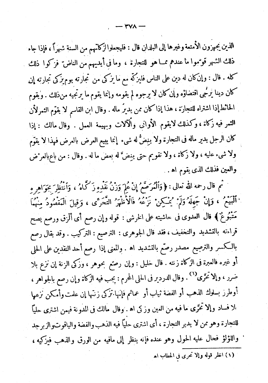 ثم قال رحمه الله تعالى: " والمرصع إن علم وزن نقده زكاه، وانتظر بجواهره البيع، وإن جهله ولم يمكن نزعه فالأظهر التحري، وقيل المقصود منهما متبوع " قال العدوي في حاشيته على الخرشي: قوله وإن رصع أي ألزق ورصع يصح قراءته بالتشديد والتخفيف، فقد قال الجوهري: الترصيع: التركيب. وقد يقال رصع بالكسر والترصيع مصدر رصع بالتشديد اهـ. والمعنى إذا رصع أحد النقدين على الحلي أو غيره فالعبرة في الزكاة زنته. قال خليل: وإن رصع بجوهر، وزكى الزنة إن نزع بلا ضرر، وإلا تحرى (¬1). وقال الدردير في الحلي المحرم: يجب فيه الزكاة وإن رصع بالجواهر، أو طرز بسلوك الذهب أو الفضة ثياب أو عمائم فإنها تزكى زنتها إن علمت وأمكن نزعها بلا فساد وإلا تحرى ما فيه من العين وزكى اهـ. وقال مالك في المدونة فيمن اشترى حليا للتجارة وهو ممن لا يدير التجارة، أي اشترى حليا فيه الذهب والفضة والياقوت والزبرجد واللؤلؤ فحال عليه الحول وهو عنده فإنه ينظر إلى ما فيه من الورق والذهب فيزكيه،