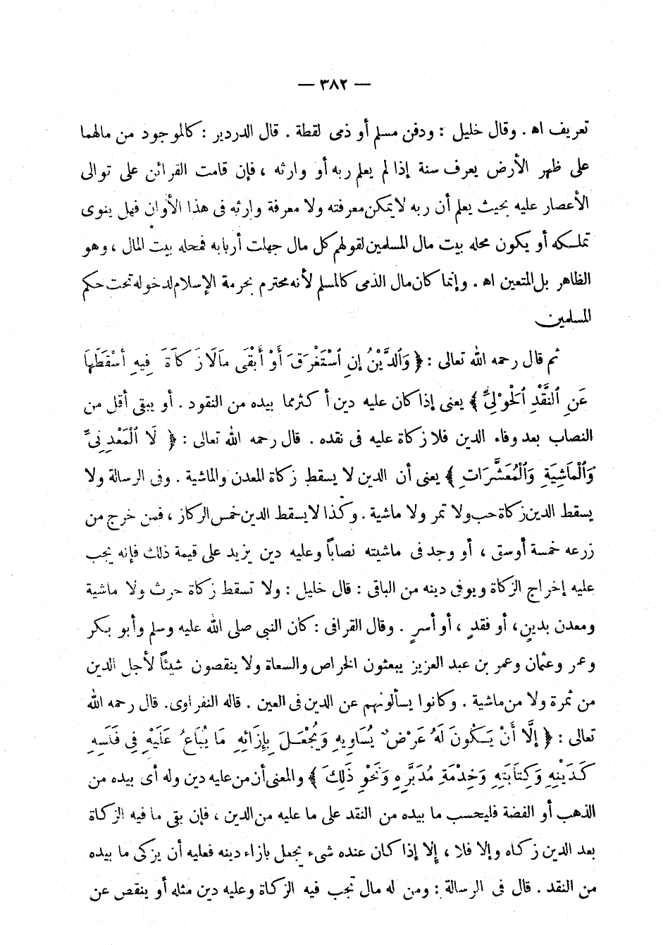 خمس الركاز، فمن خرج من زرعه خمسة أوسق، أو وجد في ماشيته نصابا وعليه دين يزيد على قيمة ذلك فإنه يجب عليه إخراج الزكاة ويوفي دينه من الباقي: قال خليل: ولا تسقط زكاة حرث ولا ماشية ومعدن بدين، أو فقد، أو أسر. وقال القرافي: كان النبي صلى الله عليه وسلم وأبو بكر وعمر وعثمان وعمر بن عبد العزيز يبعثون الخراص والسعادة ولا ينقصون شيئا لأجل الدين من ثمرة ولا من ماشية. وكانوا يسألونهم عن الدين في العين. قاله النفراوي. قال رحمه الله تعالى: " إلا أن يكون له عرض يساويه ويجعل بإزائه ما يباع عليه في فلسه كدينه وكتابته وخدمة مدبره ونحو ذلك " والمعنى أن من عليه دين وله أي بيده من الذهب أو الفضة فليحسب ما بيده من النقد على ما عليه من الدين، فإن بقي ما فيه الزكاة بعد الدين زكاه وإلا فلا، إلا إذا كان عنده شيء يجعل بإزاء دينه فعليه أن يزكي ما بيده من النقد. قال في الرسالة: ومن له مال تجب فيه الزكاة وعليه دين مثله أو ينقص عن