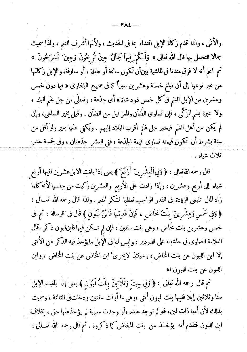 والأنثى، وإنما قدم زكاة الإبل اقتداء بما في الحديث، ولأنها أشرف النعم، ولذا سميت جمالا للتجمل بها قال الله تعالى: {وَلَكُمْ فِيهَا جَمَالٌ حِينَ تُرِيحُونَ وَحِينَ تَسْرَحُونَ} [النحل: 6] ثم اعلم أنه لا فرق عندنا في الماشية بين أن تكون سائمة أو عاملة، أو معلوفة، والإبل زكاتها من غير نوعها إلى أن تبلغ خمسة وعشرين بعيرا كما في صحيح البخاري " فيما دون خمس وعشرين من الإبل الغنم في كل خمس ذود شاة " أي جذعة، وتعطى من جل غنم البلد، ولا عبرة بغنم المزكي، فإن تساوى الضأن والمعز قيل من الضأن. وقيل يخير الساعي، وإن لم يكن من أهل الغنم فيعتبر جل غنم أقرب البلاد إليهم. ويكفي عنها بعير ولو من سنة بشرط أن تكون قيمته تساوي قيمة الجذعة، ففي العشر جذعتان، وفي خمسة عشر ثلاث شياه.