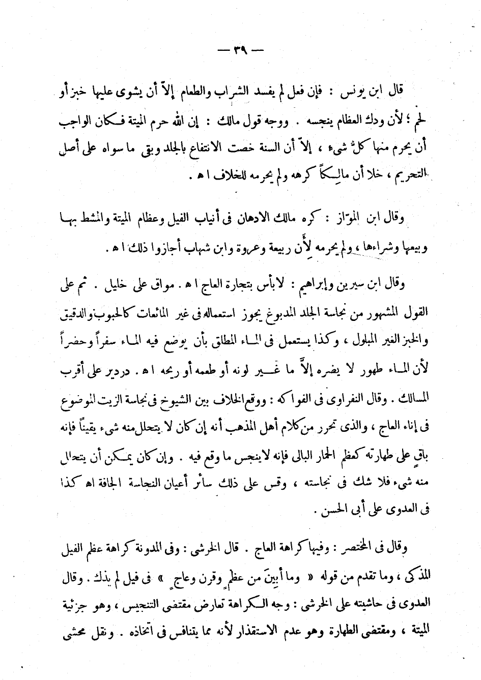كالحبوب والدقيق والخبز غير المبلول، وكذا يستعمل في الماء المطلق بأن يوضع فيه الماء سفرا وحضرا لأن الماء طهور لا يضره إلا ما غير لونه أو طعمه أو ريحه اهـ. الدردير على أقرب المسالك. وقال النفراوي في الفواكه: ووقع الخلاف بين الشيوخ في نجاسة الزيت الموضوع في إناء العاج، والذي تحرر من كلام أهل المذهب أنه إن كان لا يتحلل منه شيء يقينا فإنه باق على طهارته كعظم الحمار البالي فإنه لا ينجس ما وقع فيه. وإن كان يمكن أن يتحلل منه شيء فلا شك في نجاسته، وقس على ذلك سائر أعيان النجاسة الجافة اهـ كذا في العدوي على أبي حسن.
