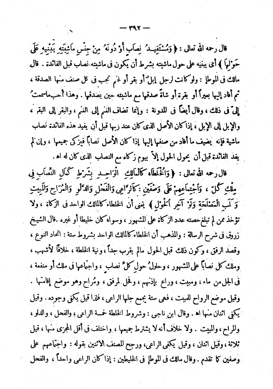 قال رحمه الله تعالى: " ومستفيد نصاب أو دونه من جنس ماشيته يبينه على حولها " أي يبينه على حول ماشيتها بشرط أن يكون في ماشيته نصاب قبل الفائدة. قال مالك في الموطأ: ولو كانت لرجل إبل أو بقر أوغنم تجب في كل صنف منها الصدقة، ثم أفاد إليها بعيرا أو بقرة أو شاة صدقها مع ماشيته حين يصدقها. وهذا أحب ما سمعت إلي في ذلك، قال أيضا في المدونة: وإنما تضاف الغنم إلى الغنم، والبقر إلى البقر، والإبل إلى الإبل، إذا كان الأصل الذي كان عند ربها قبل أن يفيد هذه الفائدة نصاب ماشية فإنه يضيف ما أفاد من صنفها إليها إذا كان الأصل نصابا فيزكي جميعها، وإن لم يفد الفائدة قبل أن يحول إلا بيوم زكاه مع النصاب الذي كان له اهـ.