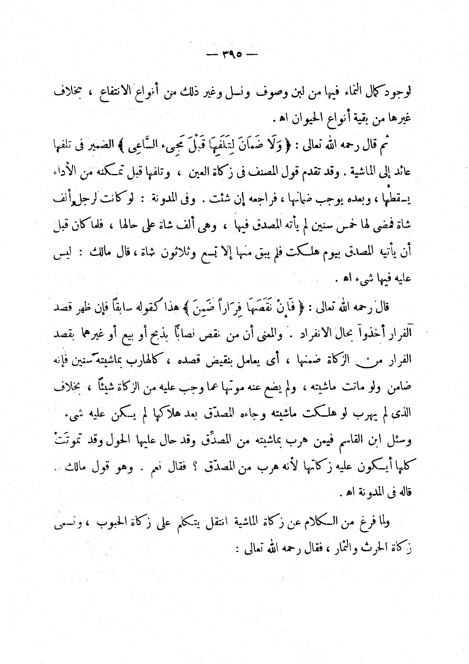 ثم قال رحمه الله تعالى: " ولا ضمان لتلفها قبل مجيء الساعي " الضمير في تلفها عائد إلى الماشية. وقد تقدم قول المصنف في زكاة العين، وتلفها قبل تمكنه من الأداء يسقطها، وبعده يوجب ضمانها، فراجعه إن شئت. وفي المدونة: ولو كانت لرجل ألف شاة فمضى لها خمس سنين لم يأته المصدق فيها، وهي ألف شاة على حالها، فلما كان قبل أن يأتيه المصدق بيوم هلكت فلم يبق منها إلا تسع وثلاثون شاة، قال مالك: ليس عليه فيها شيء اهـ.