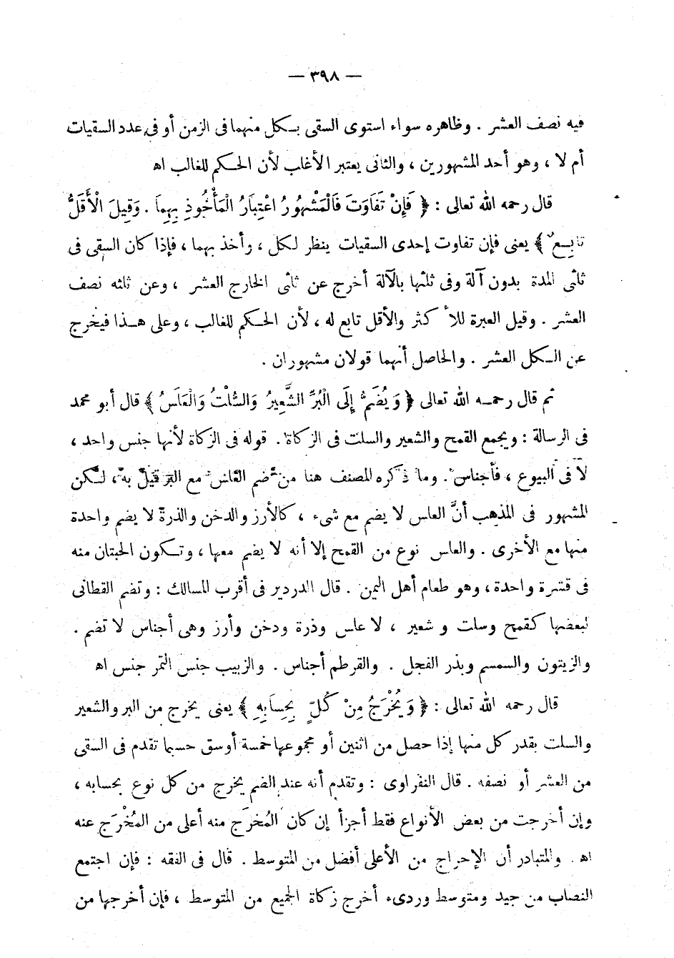 قال رحمه الله تعالى: " ويخرج من كل بحسابه " يعني يخرج من البر والشعير والسلت بقدر كل منها إذا حصل من اثنين أو مجموعها خمسة أوسق بحسبما تقدم في السقي من العشر أو نصفه. قال النفراوي: وتقدم أنه عند الضم يخرج من كل نوع بحسابه، وإن أخرجت من بعض الأنواع فقط أجزأ إن كان المخرج منه أعلى من المخرج عنه اهـ. والمتبادر أن الإخراج من الأعلى أفضل من المتوسط. قال في الفقه: فإن اجتمع النصاب من جيد ومتوسط ورديء أخرج زكاة الجميع من المتوسط، فإن أخرجها من