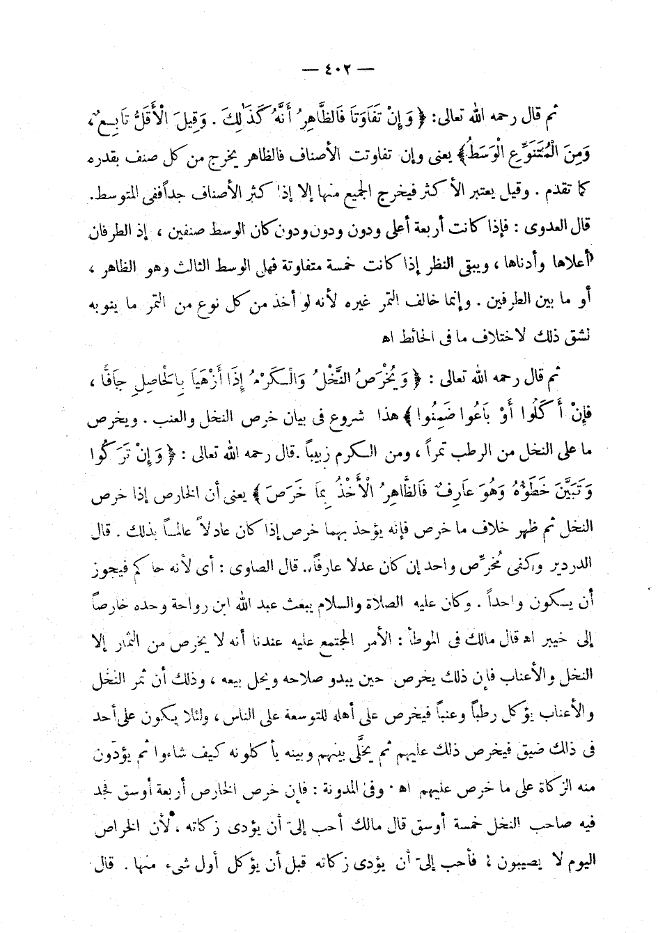 ثم قال رحمه الله تعالى: " ويخرص النخل والكرم إذا أزهيا بالحاصل جافا، فإن أكلوا أو باعوا ضمنوا " هذا شروع في بيان خرص النخل والعنب. ويخرص ما على النخل من الرطب تمرا، ومن الكرم زبيبا. قال رحمه الله تعالى: " وإن تركوا وتبين خطؤه وهو عارف فالظاهر الأخذ بما خرص " يعني أن الخارص إذا خرص النخل ثم ظهر خلاف ما خرص فإنه يؤخذ بهما خرص إذا كان عادلا عالما بذلك.