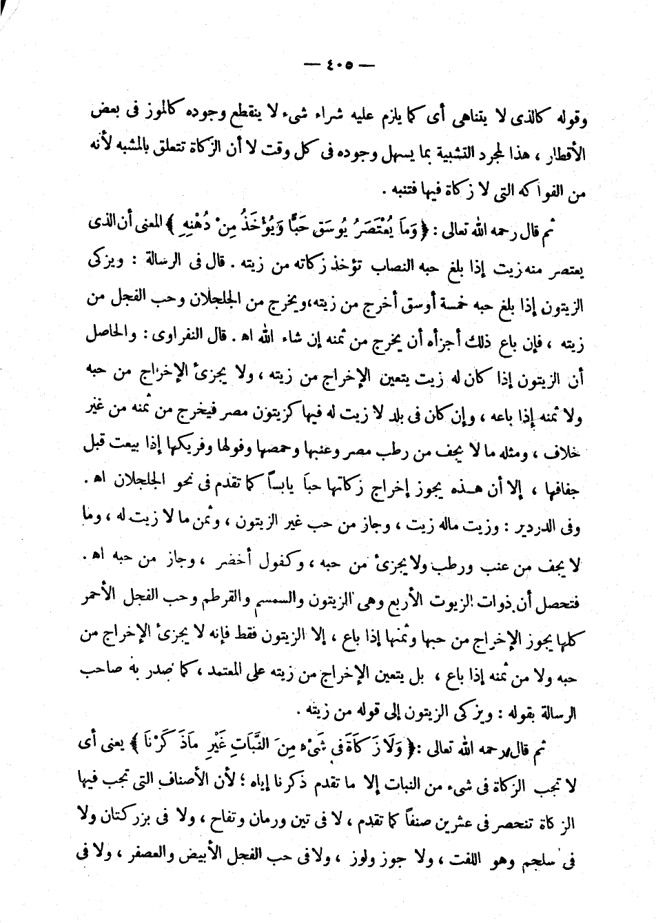 يسهل وجوده في كل وقت لاأن الزكاة تتعلق بالمشبه لأنه من الفواكه التي لا زكاة فيها فتنبه. ثم قال رحمه الله تعالى " وما يعتصر يوسق حبا ويؤخذ من دهنه " المعنى أن الذي يعتصر منه زيت إذا بلغ حبه النصاب تؤخذ زكاته من زيته. قال في الرسالة: ويزكى الزيتون إذا بلغ حبه خمسة أوسق أخرج من زيته , فإن باع ذلك أجزأه أن يخرج من ثمنه إن شاء الله اهـ. قال النفراوي: والحاصل أن الزيتوت إذا كان له زيت يتعين الإخراج من زيته , ولا يجزئ الإخراج من حبه ولا ثمنه إذا باعه , وإن كان فى بلد لا زيت له فيها كزيتون مصر فيخرج من ثمنه من غير خلاف , ومثله ما لا يجف من رطب مصر وعنبها وحمصها وفولها وفريكها إذا بيعت قبل جفافها , إلا أن هذه يجوز إخراج زكاتها حبا يابسا كما تقدم في نحو الجلجلان اهـ. وفي الدردير: وزيت ما له زيت , وجاز من حب غير الزيتون , وثمن ما لا زيت له، وما لا يجف من عنب ورطب ولا يجزئ من حبه , وكفول أخضر , وجاز من حبه اهـ. فتحصل أن ذوات الزيوت الأربع وهي الزيتون والسمسم والقرطم وحب الفجل الأحمر كلها يجوز الإخراج من حبها وثمنها إذا باع , إلا الزيتون فقط فإنه لا يجزئ الإخراج من حبه ولا من ثمنه إذا باع , بل يتعين الإخراج من زيته على المعتمد , كما صدر به صاحب الرسالة بقوله: ويزكى الزيتون إلى قوله من زيته.