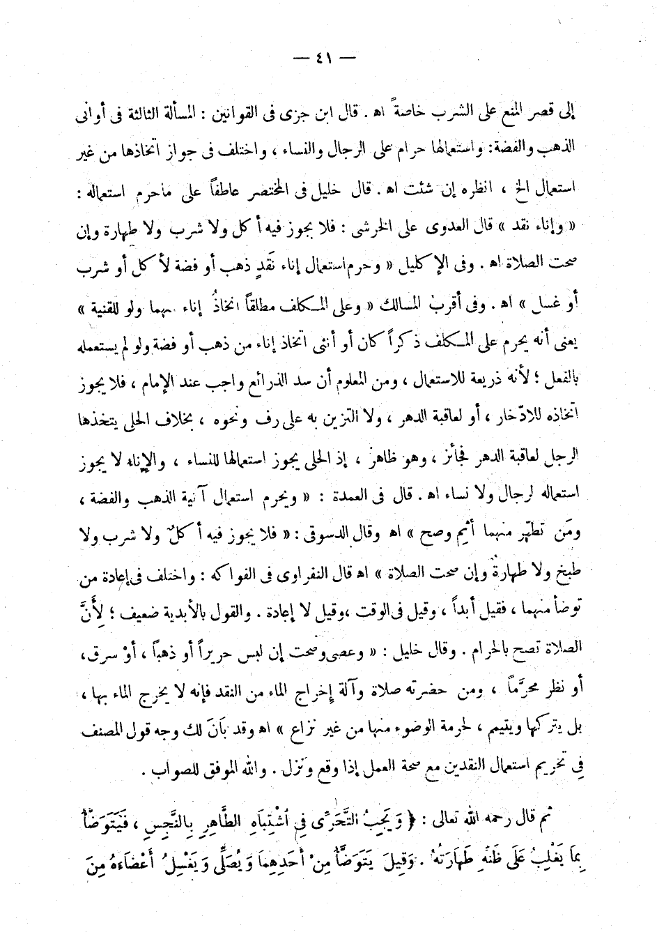 إلى قصر المنع على الشرب خاصة اهـ. قال ابن جزي في القوانين: المسألة الثالثة في أواني الذهب والفضة: واستعمالها حرام على الرجال والنساء، واختلف في جواز اتخاذها من غير استعمال إلخ، انظره إن شئت اهـ. قال خليل في المختصر عاطفا على ما حرم استماله: " وإناء نقد " قال العدوي على الخرشي: فلا يجوز فيه أكل ولا شرب ولا طهارة وإن صحت الصلاة اهـ.