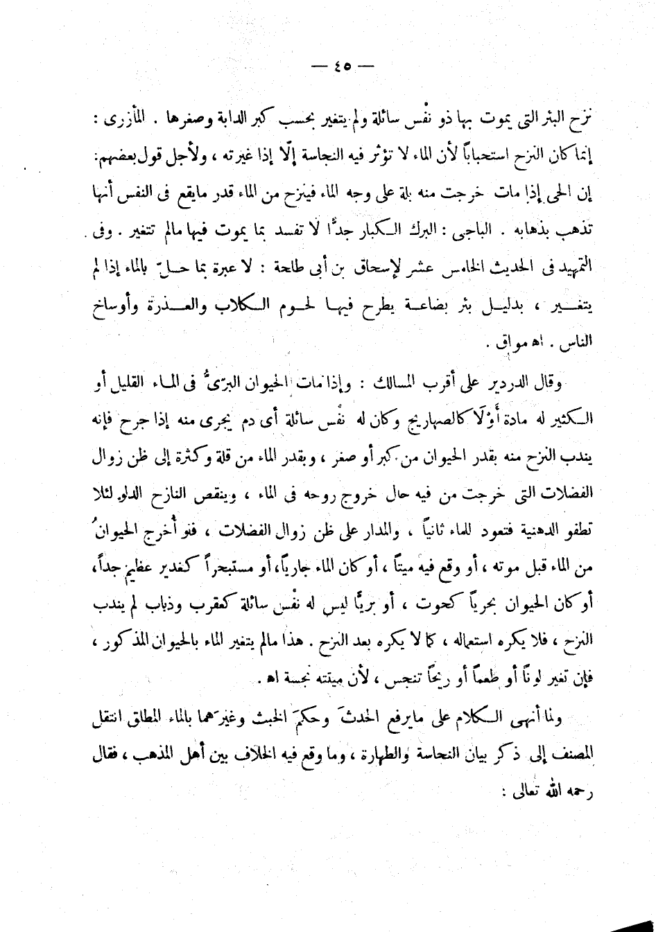 نزح البئر التي يموت بها ذو نفس سائلة ولم يتغير بحسب كبر الدابة وصغرها. المأزري: إنما كان النزح استحبابا لأن الماء لا تؤثر فيه النجاسة إلا إذا غيرته، ولأجل قول بعضهم: إن الحي إذا مات خرجت